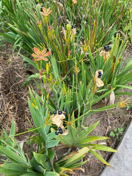 Hoa mọc thường mọc theo cụm, bao hoa có 6 mảnh màu cam, vàng xem với đốm đỏ. Quả có hình dáng giống với trứng chim sẻ, màu đen bóng.