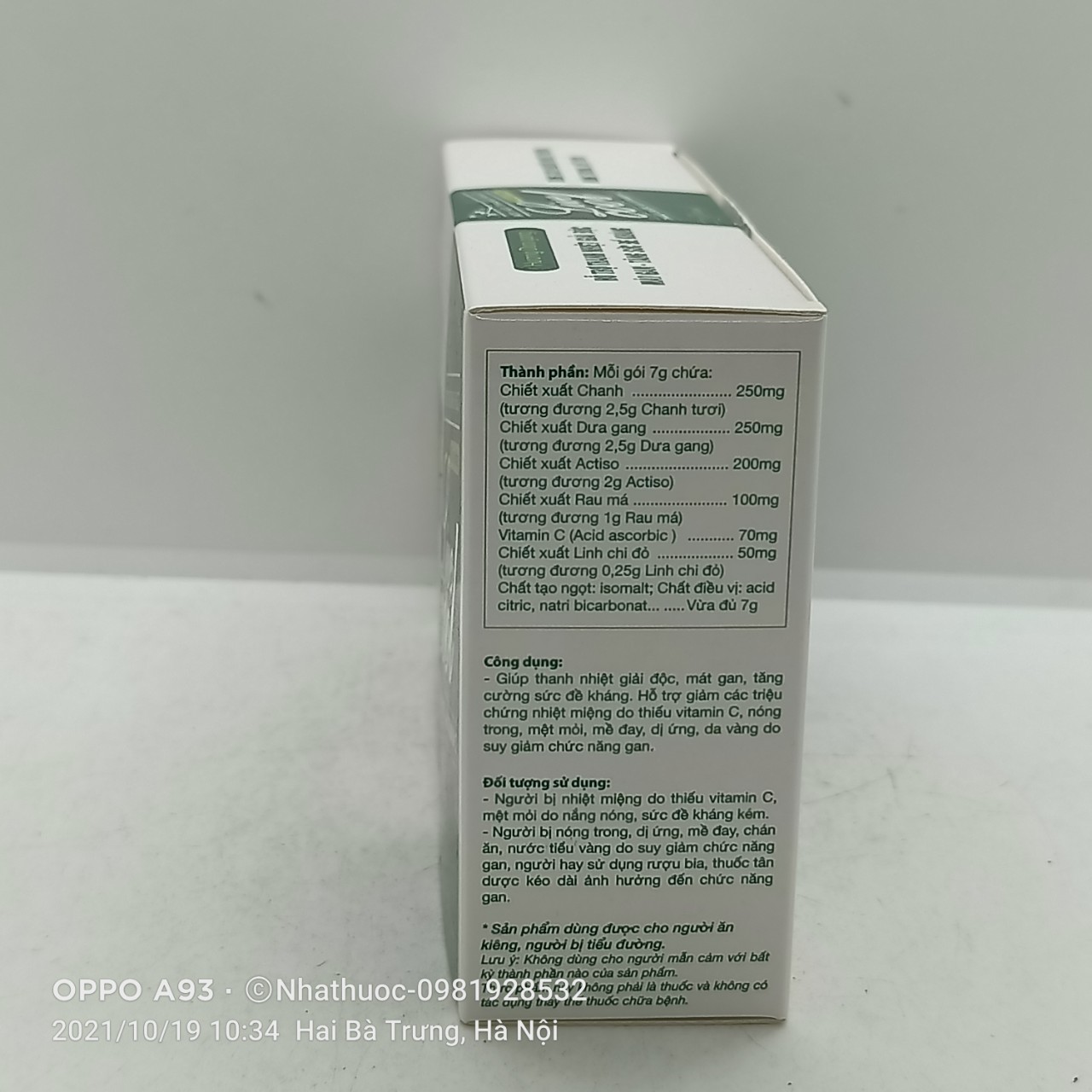 Đối Tượng Sử Dụng: Người bị nhiệt miệng do thiếu vitamin C, mệt mỏi do nắng nóng & sức đề kháng kém Người bị nóng trong, dị ứng, mề đay, chán ăn & nước tiểu vàng do suy giảm chức năng gan Người hay sử dụng sản phẩm khác ảnh hưởng đến chức năng gan Cách Dùng: Trẻ em từ 3 - 10 tuổi: 1 gói x 2 - 3 lần/ngày Người lớn & trẻ em từ 10 tuổi trở lên: 1 gói x 3 - 4 lần/ngày Cắt 1 gói bột cho vào cốc, sau đó thêm 200 - 250ml nước đun sôi để nguội & ngon hơn khi uống lạnh Không pha với nước nóng để tránh làm ảnh hưởng đến tác dụng của sản phẩm *Lưu ý: - Tác dụng của sản phẩm tùy thuộc vào cơ địa hấp thu của từng người
