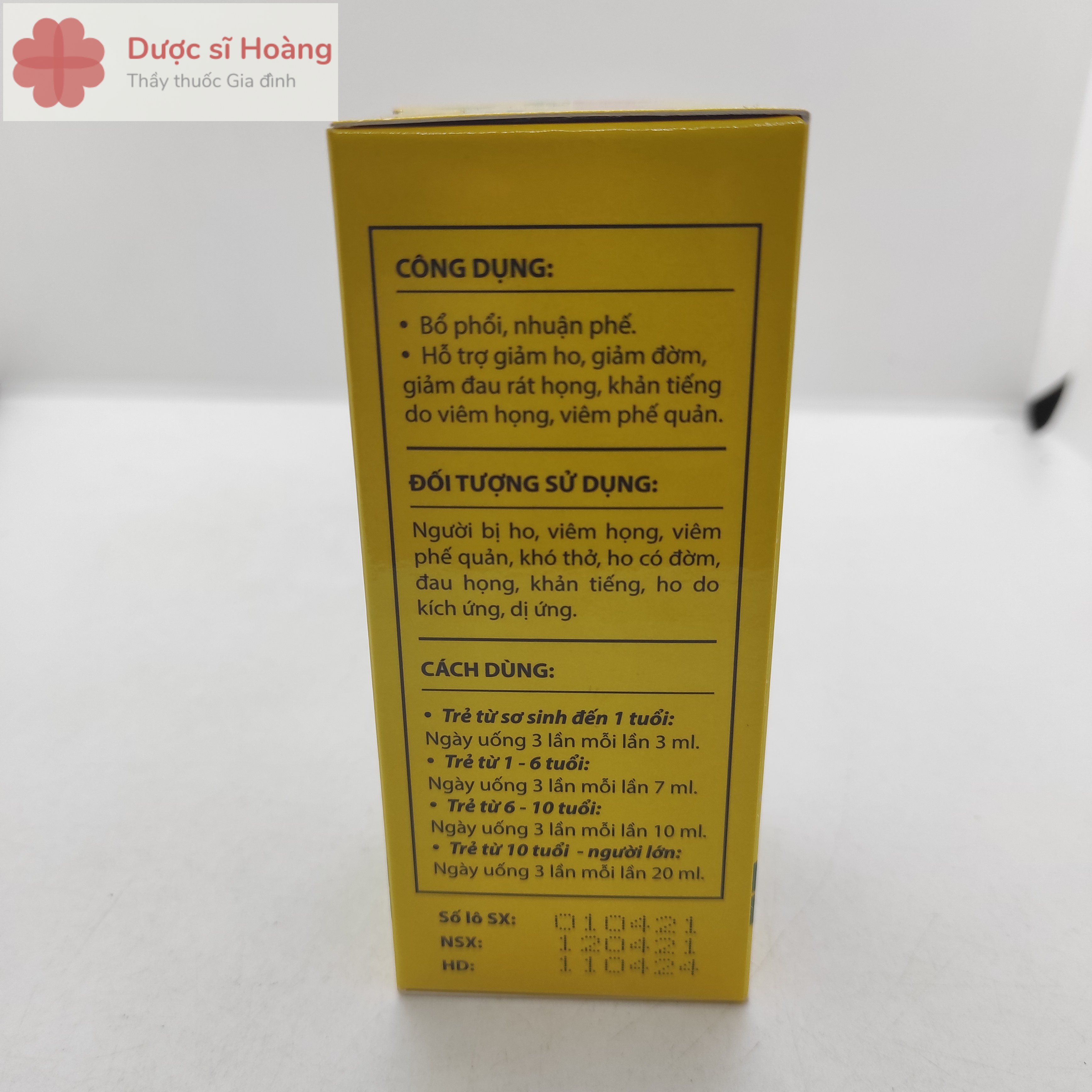 Đối tượng sử dụng Người bị ho, viêm họng, viêm phế quản, khó thở, ho có đờm, đau họng, khản tiếng, ho do kích ứng, dị ứng. Hướng dẫn sử dụng Trẻ từ sơ sinh đến 1 tuổi: ngày uống 3 lần, mỗi lần 3ml. Trẻ từ 1-6 tuổi: ngày uống 3 lần, mỗi lần 7ml. Trẻ từ 6-10 tuổi: ngày uống 3 lần, mỗi lần 10ml. Trẻ từ 10 tuổi và người lớn: ngày uống 3 lần, mỗi lần 20ml.
