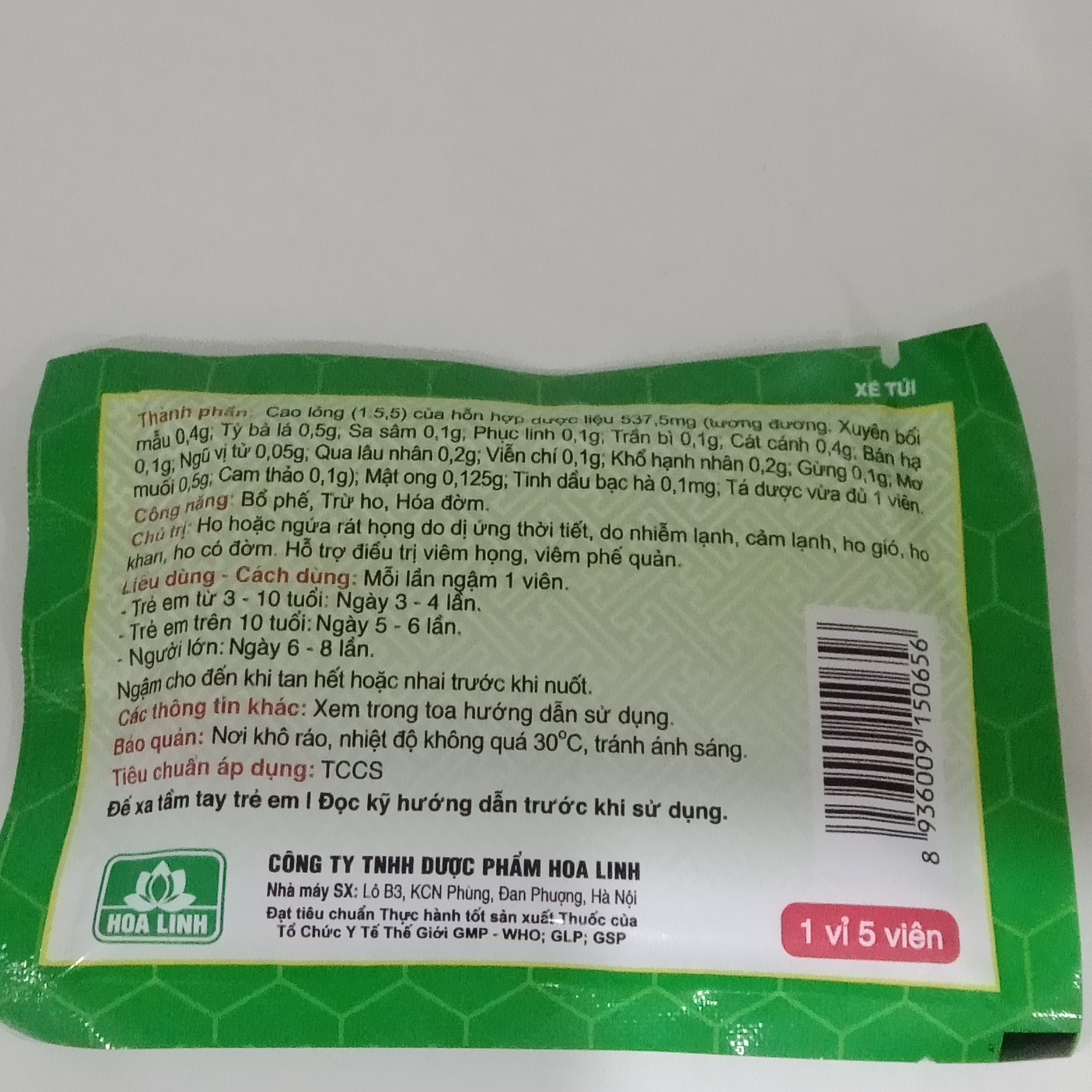 Viên dễ tan. Tan đến đâu, cao dược liệu có tác dụng làm dịu họng tới đó. Đồng thời, bao phủ, bảo vệ niêm mạc họng, ngăn không cho các kích thích phát sinh. Do vậy, giảm ngứa rát họng và giảm ho tại chỗ (giảm ho theo cơ chế ngoại vi)