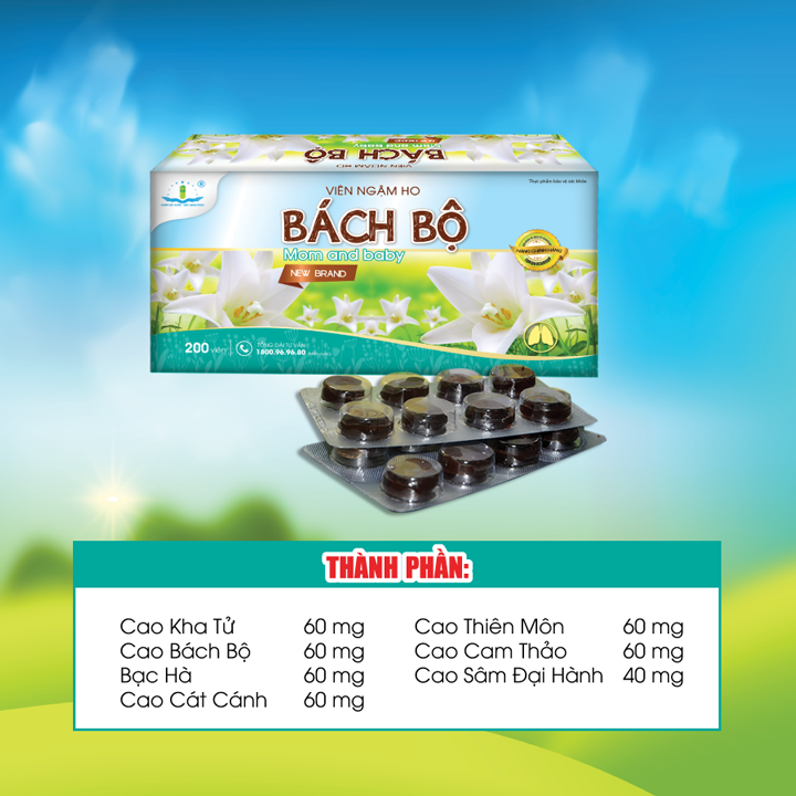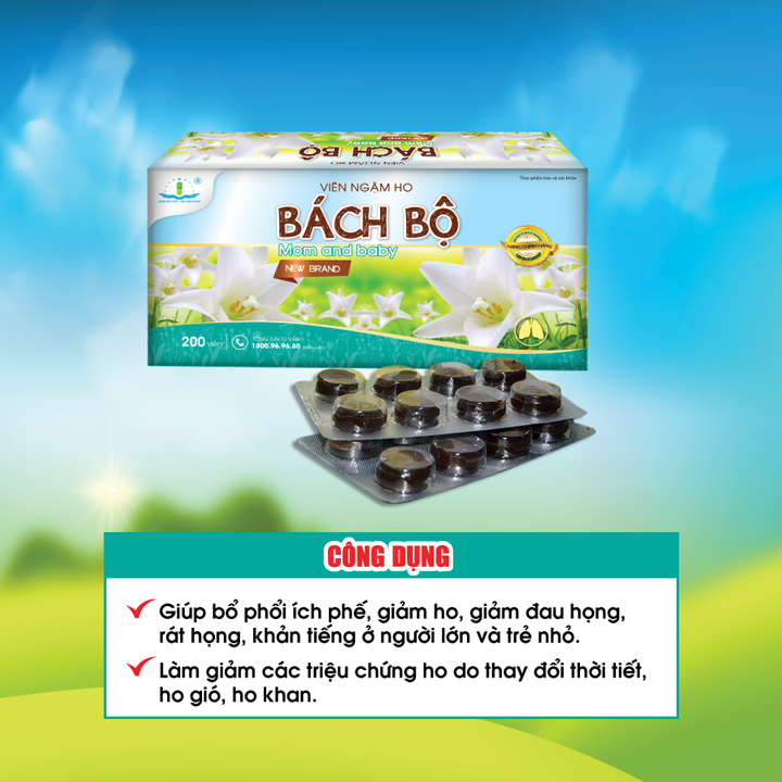 Chúng ta ai cũng từng trải qua các cơn ho trong đời và ý thức rất rõ những cản trở của nó đối với sức khỏe và đời sống sinh hoạt. Nếu bạn vẫn đang trong ngày đêm vật vã với cơn ho từng hồi mà không thể tự kìm chế hoặc những cơn ho kéo dài về đêm làm ảnh hưởng đến chất lượng giấc ngủ, chi phối cảm xúc của bạn. Bạn từng loay hoay tìm kiếm các bài thuốc nam giảm ho với mong muốn chữa lành bệnh từ sự thân thiện với thiên nhiên nhưng lại không có thời gian để thực hiện. Hoặc bạn đang muốn tìm một giải pháp giảm ho tiện lợi mà vẫn đảm bảo an toàn tuyệt đối và hiệu quả. Giới thiệu đến bạn, VIÊN NGẬM HO BÁCH BỘ MOM AND BABY là viên ngậm ho được chế xuất từ bài thuốc gia truyền bổ phế, tiêu đờm, trừ ho gồm 7 vị dược liệu.