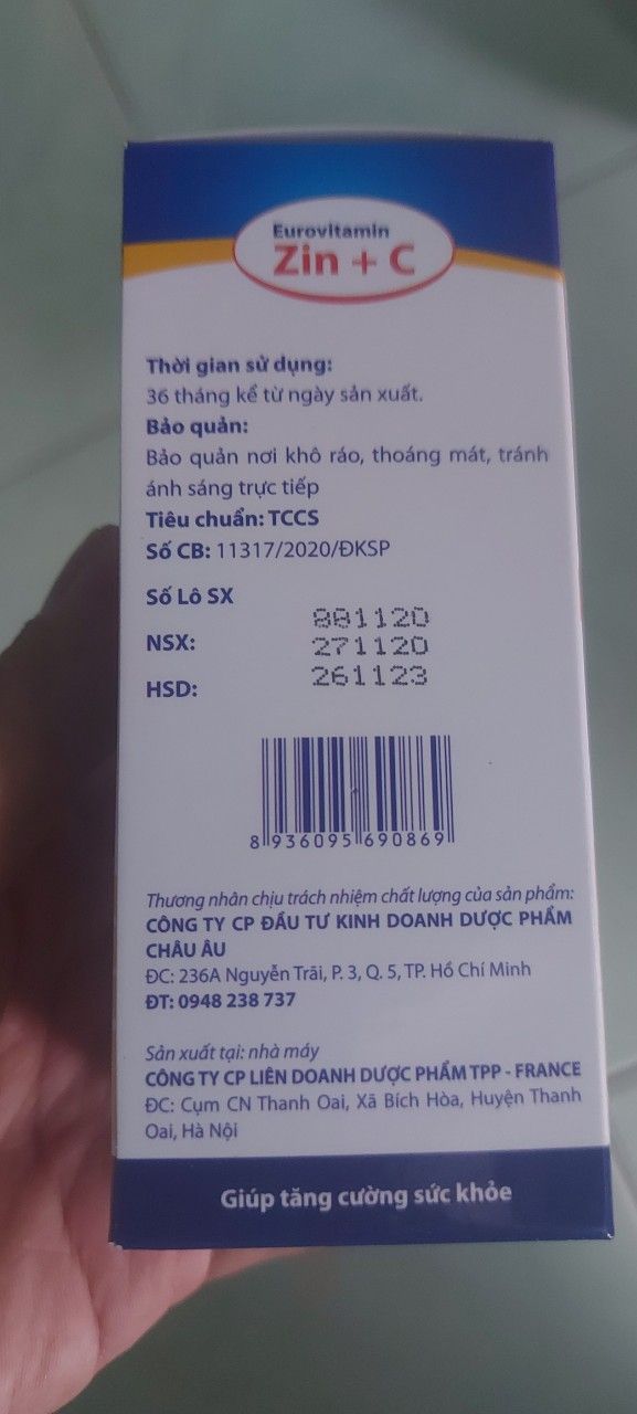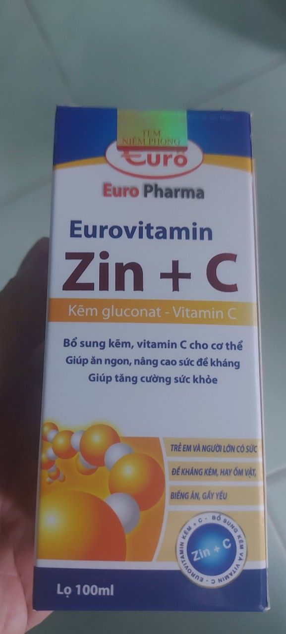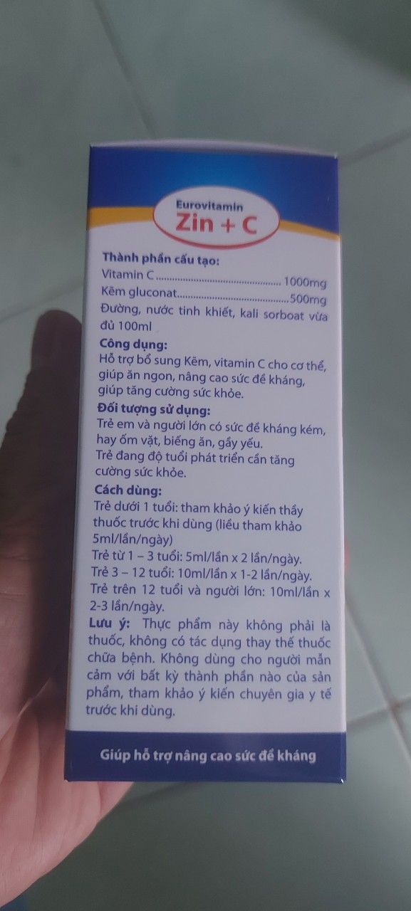 💖Cam kết hàng chính hãng chất lượng-uy tín-nguồn gốc rõ ràng💖Phân phối sỉ và lẻ: 0396527559 🌟 Eurovitamin Zin + C🌟👉Thành phần: Vitamin C: ..............1000mg kẽm gluconat......... 500mg👉 Công dụng:Hộ trợ bổ sung kẽm, vitamin C cho cơ thể.Giúp ăn ngon, nâng cao sức đề kháng.Giúp tăng cường sức khỏe.👉 Đối tượng sử dụng: Trẻ em và người lớn có sức đề kháng kém, hay ốm vặt, biếng ăn, gầy yếu Trẻ đang độ tuổi phát triển cần tăng cường sức khỏe.👉 Cách dùng: Trẻ dưới 1tuổi: 5ml/lần/ngày ( tham khảo ý kiến bác sỹ) Trẻ 1-3 tuổi: 5 ml/lần x2 lần/ngày Trẻ 3-12 tuổi: 10ml/lần x 2 lần/ ngày Trẻ trẻ 12 tuổi và người lớn : 10ml/ lần x 3 lần/ngày.#tangsucdekhang#giupbeanngon#tangcuongsuckhoe
