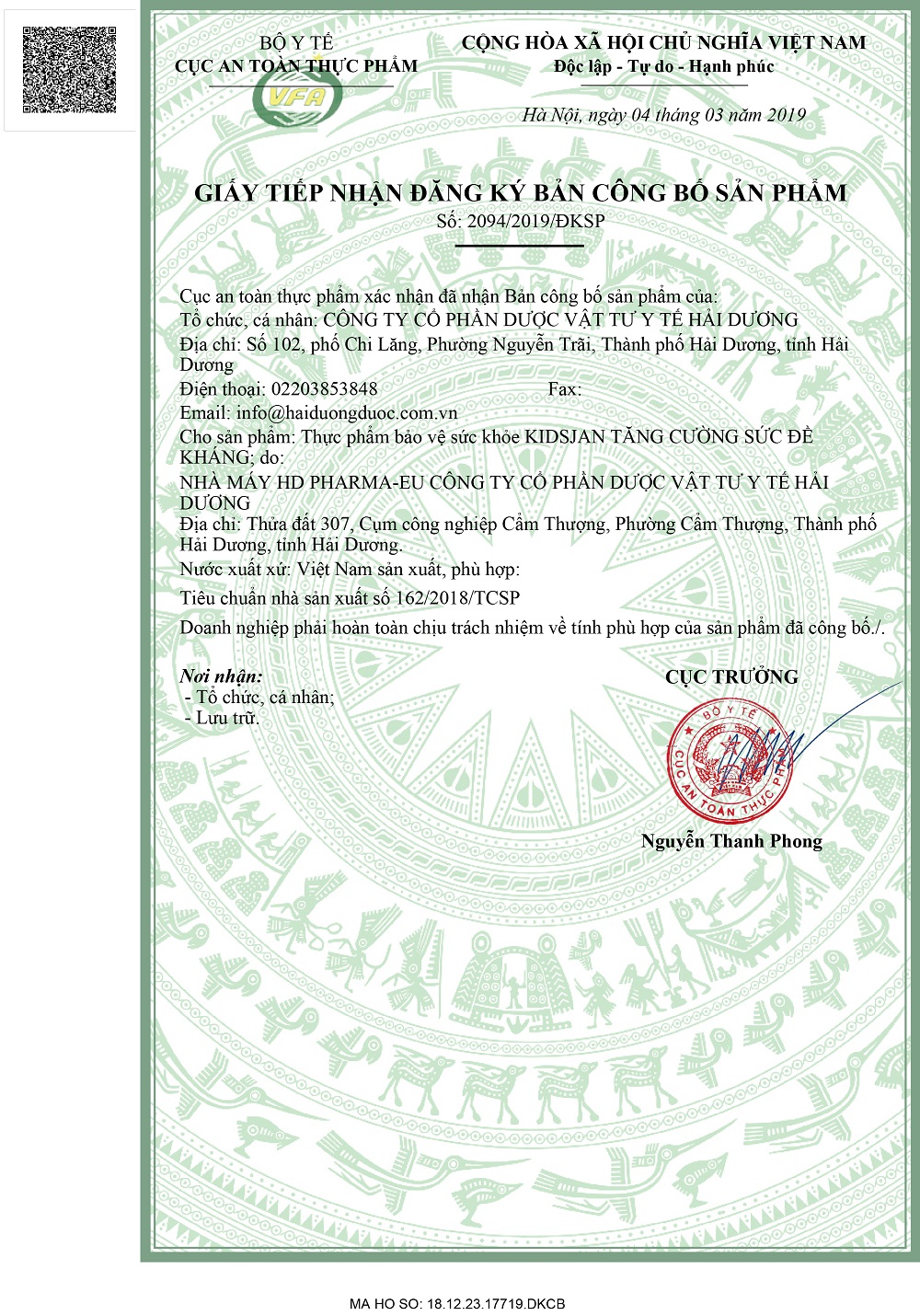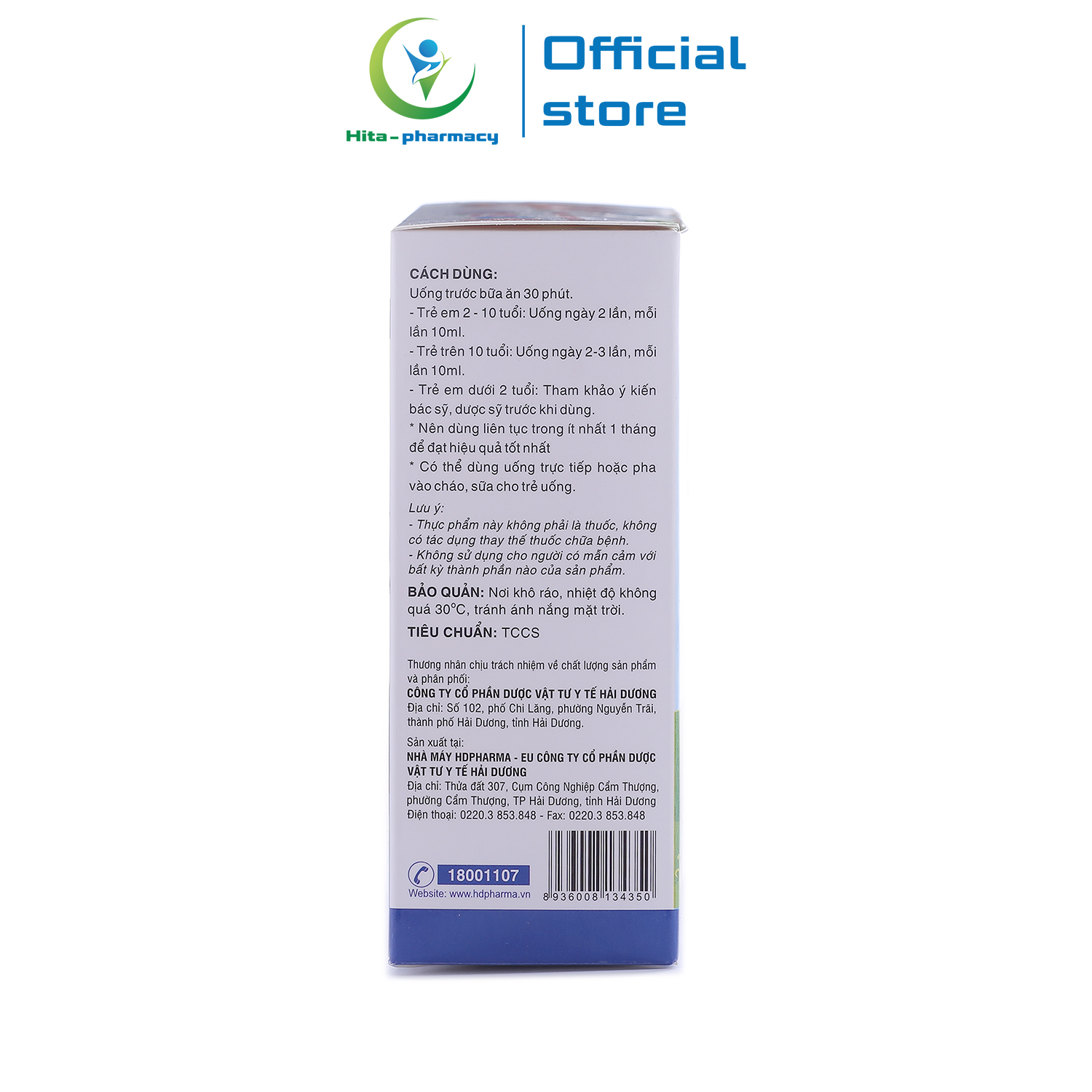 - Chịu trách nhiệm chất lượng và phân phối: Công ty Cổ Phần Dược Vật Tư Y Tế Hải Dương.