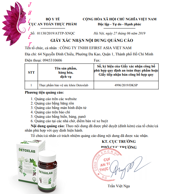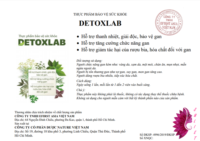 DETOXLAB là một sản phẩm đập tan ký sinh trùng dạng viên nang giúp phục hồi hệ vi sinh đường ruột, đào thải độc tố trong gan, giảm hôi miệng, thanh lọc cơ thể…an toàn với sức khỏe mà không lo bất kì tác dụng phụ nào.Sản phẩm được nghiên cứu và chế tạo thành công bởi trung tâm ký sinh trùng học và nhóm các nhà khoa học tại Đức.Ngoài việc giúp tiêu diệt hay loại bỏ ký sinh trùng ra thì Detoxlab còn giúp người sử dụng cải thiện vị giác, giúp ăn ngon miệng hơn, cơ thể hấp thụ các dinh dưỡng tốt hơn.DETOXLAB được sản xuất tại CÔNG TY CỔ PHẦN DƯỢC NATURE VIỆT NAMThương nhân chịu trách nhiệm về chất lượng sản phẩm CÔNG TY TNHH EFIRST ASIA VIỆT NAMSố Đăng Ký: 4996/2019/ĐKSP