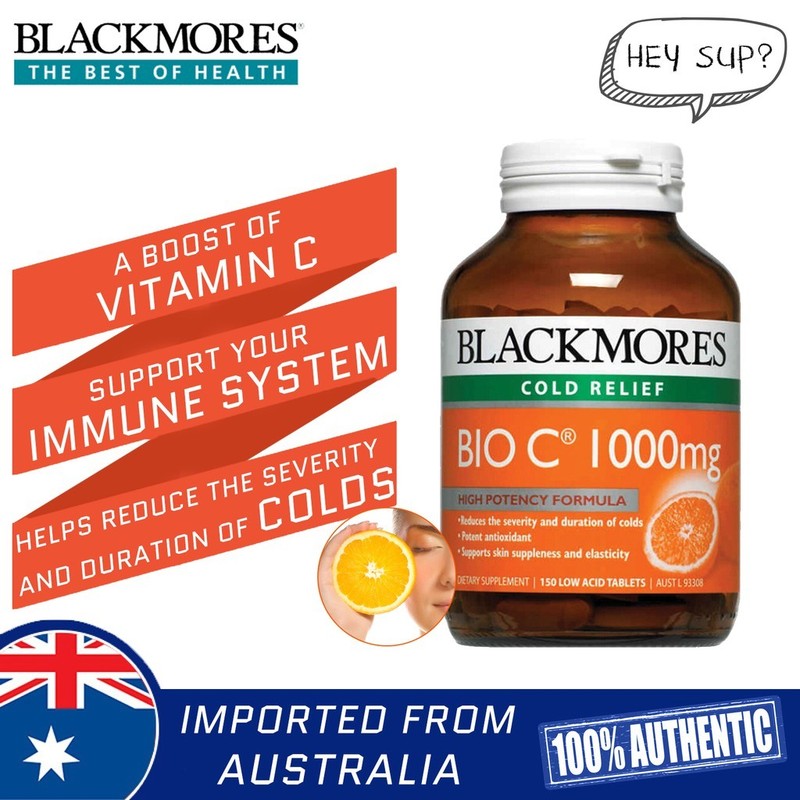Phòng chống bệnh tim mạchVitamin C còn giúp thành mạch máu vững chắc, đặc biệt quan trong đối với mạch máu nuôi tim. Giúp chuyển cholesterol thành acid mật, bằng cách giảm tình trạng cholesterol trong máu. Chúng có thể làm giảm mức LDL-C (cholesterol có hại) và làm tăng HDL-C (loại có lợi).Loại vitamin này còn giúp hạn chế tăng huyết áp, chống tạo cục máu đông để giảm thuyên tắc mạch.Bổ sung vitamin C cho cơ thểHướng dẫn sử dụngNgười lớn: Uống một viên mỗi ngày, tốt hơn với bữa ăn chính, hoặc theo chỉ định của bác sĩ.Đối với trẻ em 4-12 tuổi: nên dùng Viên Uống Chống Cảm Cúm Blackmores cho trẻ em.Thành phầnHoạt chất mỗi Viên C Blackmores 1000mg 150 viên:Ascorbic Acid 400mg;Sodium ascorbate 350mg;Calcium ascorbate 400mg, (tương đương với vitamin C 1000mg.);Bioflavonoids 25mg;Rutin 50mg;Hesperidin 50mg;Tầm xuân (Quả hoa hồng dại) trích xuất tương đương với nụ tầm xuân khô 250mg;Malpighlia punicifolia (Acerola) chiết xuất tương đương với 50mg lượng trái khô.