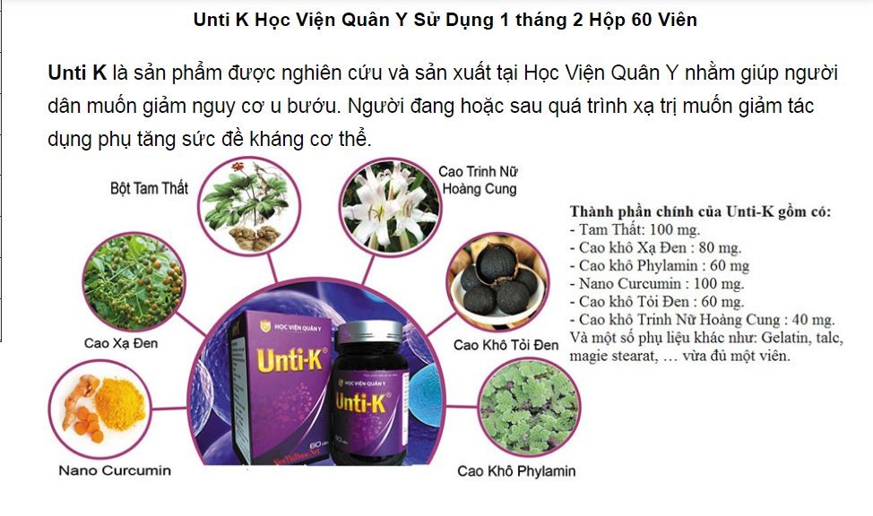 Unti K Học Viện Quân Y - Hỗ trợ điều trị ung thư hiệu quả caoUnti K là sản phẩm được nghiên cứu và sản xuất tại