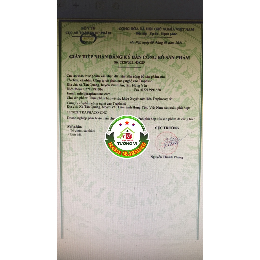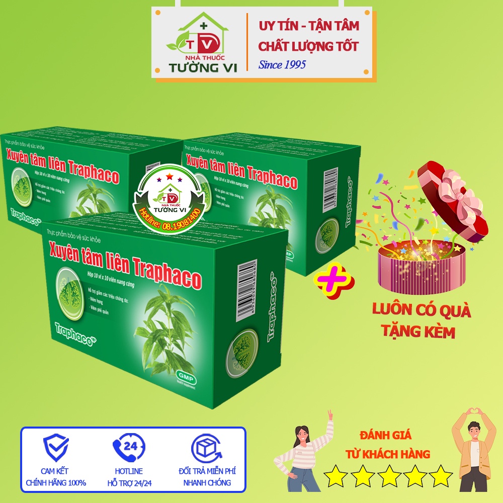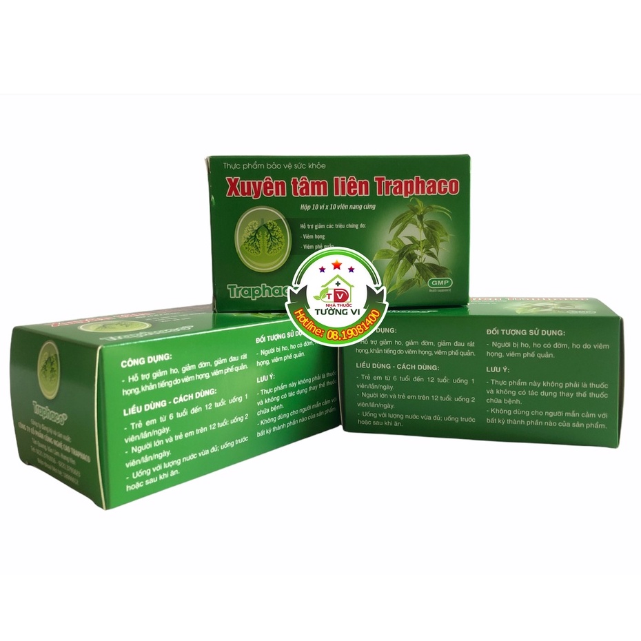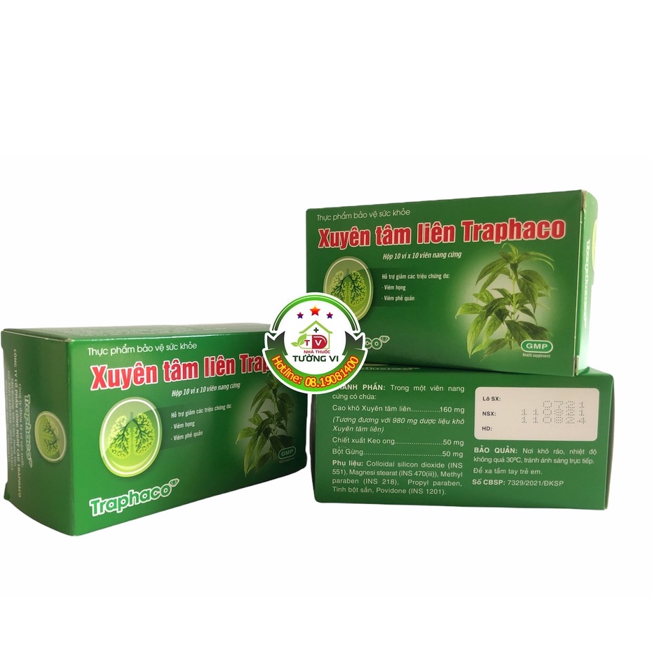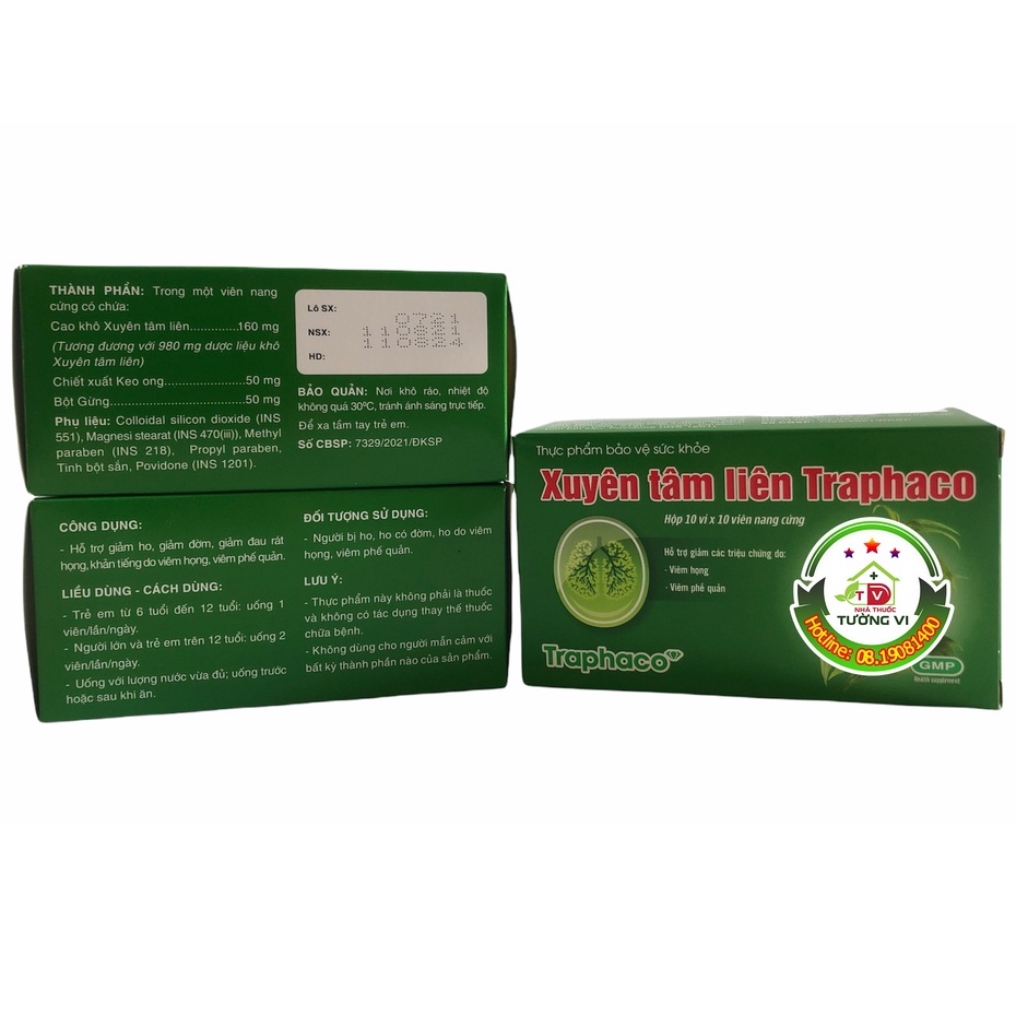 🌻 CÔNG DỤNG:Hỗ trợ giảm các triệu chứng ho, viêm họng, viêm phế quản🌻 THÀNH PHẦN:Trong một viên nang cứng có chứa:Cao khô Xuyên Tâm Liên ......................160mgChiết xuất Keo Ong .......................50mgBột Gừng...........................50mgPhụ liệu vừa đủ 1 viên🌻 ĐỐI TƯỢNG SỬ DỤNG:Người bị viêm họng, viêm phế quản, ho🌻 BẢO QUẢN:Nơi khô ráo, nhiệt độ không quá 30 độ C, tránh ánh sáng trực tiếp.Để xa tầm tay trẻ em🌻 QUY CÁCH:Hộp 10 vỉ x 10 viên nang cứng🌻 XUẤT XỨ:Việt Nam🌻 SẢN XUẤT:Công ty cổ phần Traphaco🌻 SỐ CÔNG BỐ SẢN PHẨM:7329/2021/ĐKSP
