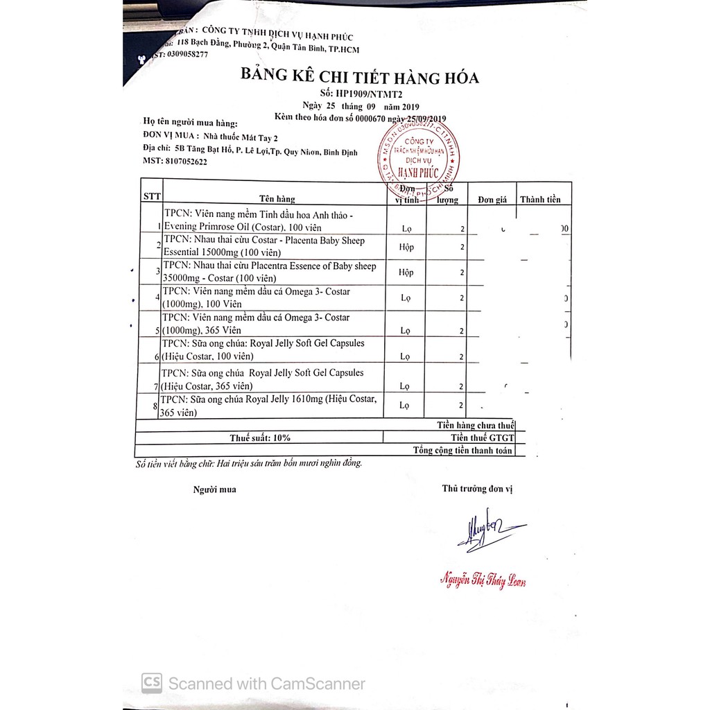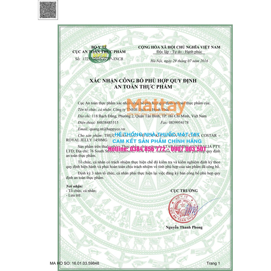 ⭐️ Hệ thống nhà thuốc Mát Tay rất vui vì bạn đã tham quan cửa hàng của chúng tôi. Chúng tôi cam kết tất cả các sản phẩm của Hệ thống nhà thuốc Mát Tay phân phối 100% sản phẩm chính hãng, giá bán chuẩn nhất thị trường, nếu bạn phát hiện sản phẩm của chúng tôi cung cấp không phải chính hãng chúng tôi xin hoàn gấp đôi số tiền mà bạn đã đặt mua tại cửa hàng của chúng tôi. Trong quá trình sử dụng sản phẩm bạn có thắc mắc hoặc cần tư vấn về sức khỏe hay sản phẩm xin vui lòng gọi qua zalo số điện thoại 0907003501 hoặc 0384856772 đội ngũ dược sĩ đại học trên 10 năm kinh nghiệm của chúng tôi rất vinh dự được phục vụ bạn.⭐️ Quy cách : Chai 100 Viên⭐️ Xuất xứ : Úc⭐️ Thành phần : Chứa 18% protein, 10-17% glucid, 5,5% lipid, khoảng 20 loại acid amin quan trọng, trong đó, nhiều loại cơ thể con người không tổng hợp được, , là cystein, các acid hữu cơ, các vitamin A, B1, B2, B6, B12 , PP, các kích thích tố, muối khoáng, một số enzym, hormon hướng sinh dục. - Công dụng : Tăng cường hệ miễn dịch cho cơ thể, nâng cao tính miễn nhiễm, - Nâng cao và cải thiện trí nhớ, tăng cường thể lực và giúp sáng mắt. - Giúp điều hòa máu cao máu, cao huyết áp, mỡ trong máu, tiểu đường, viêm gan A,B,C,D và các , về gan. - Chống lại sự già nua của làn da nhờ những cơ chế hoạt động tái tạo và kích thích sản sinh té bào mới cho da. -Cung cấp lượng chất dinh dưỡng cho hệ thống có thể (Axit 10-hydroxy-2decenoic, anti-bacterial,..) -Tăng cường quá trình trao đổi chất, xóa bỏ nếp nhăn, kháng khuẩn, chống viêm da, ngăn ngừa mụn, làm lành các vết thương, duy trì sắc đẹp. -Chống rụng tóc - Tăng cường sinh lực, phục hồi khả năng tình dục ở cả hai giới, ổn định sự rối loạn kích thích tố sinh lý, liệt dương ở phái nam.- Cách dùng : Uống 1 viên /lần, có thể dùng 1 đến 2 viên mỗi ngày 🚫 Chú ý : - Sản phẩm này không phải là thuốc, không có tác dụng thay thế thuốc chữa bệnh. - Không sử dụng cho người có mẫn cảm với bất kỳ thành phần nào của sản phẩm.- Đọc kĩ hướng dẫn sử dụng trước khi dùng. - Không dùng cho trẻ em. - Không dùng cho những người bị hen suyễn và bị dị ứng với phấn hoa 💕 Sản phẩm hiện có bán tại Hệ Thống Mát Tay 💕 o MÁT TAY SỐ 1: 210 BẠCH ĐẰNG, TP QUY NHƠN. o MÁT TAY SỐ 2: 05B TĂNG BẠT HỔ, TP QUY NHƠN. o MÁT TAY SỐ 3: NGÃ 3 ĐIỆN BIÊN PHỦ – TRƯƠNG VĨNH KÝ, TP QUY NHƠN. o MÁY TAY SỐ 6: 03 LÊ THANH NGHỊ, KHU BẮC SÔNG HÀ THANH, TP QUY NHƠN. Điện thoại: 0907.033.501 – 0384.856.722. ⭐️ ROYAL JELLY 1450 C/365 COSTA💕 Sản phẩm hiện có bán tại Hệ Thống Mát Tay 💕 o MÁT TAY SỐ 1: 210 BẠCH ĐẰNG, TP QUY NHƠN. o MÁT TAY SỐ 2: 05B TĂNG BẠT HỔ, TP QUY NHƠN. o MÁT TAY SỐ 3: NGÃ 3 ĐIỆN BIÊN PHỦ – TRƯƠNG VĨNH KÝ, TP QUY NHƠN. o MÁY TAY SỐ 6: 03 LÊ THANH NGHỊ, KHU BẮC SÔNG HÀ THANH, TP QUY NHƠN. Điện thoại: 0907.033.501 – 0384.856.722.