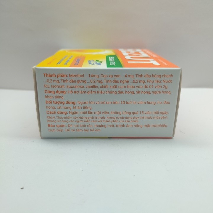 Không uống nước lạnh trong khi ngậm và ngay sau khi ngậm.6. Thời hạn sử dụng36 tháng kể từ ngày sản xuất. Ngày sản xuất và hạn sử dụng ghi ở trên nhãn sản phẩm.7. Bảo quản- Để nơi khô ráo, thoáng mát, tránh ánh sáng mặt trời.- Để xa tầm tay trẻ em8. Quy cách đóng gói:Hộp 5 vỉ. Vỉ 4 viên