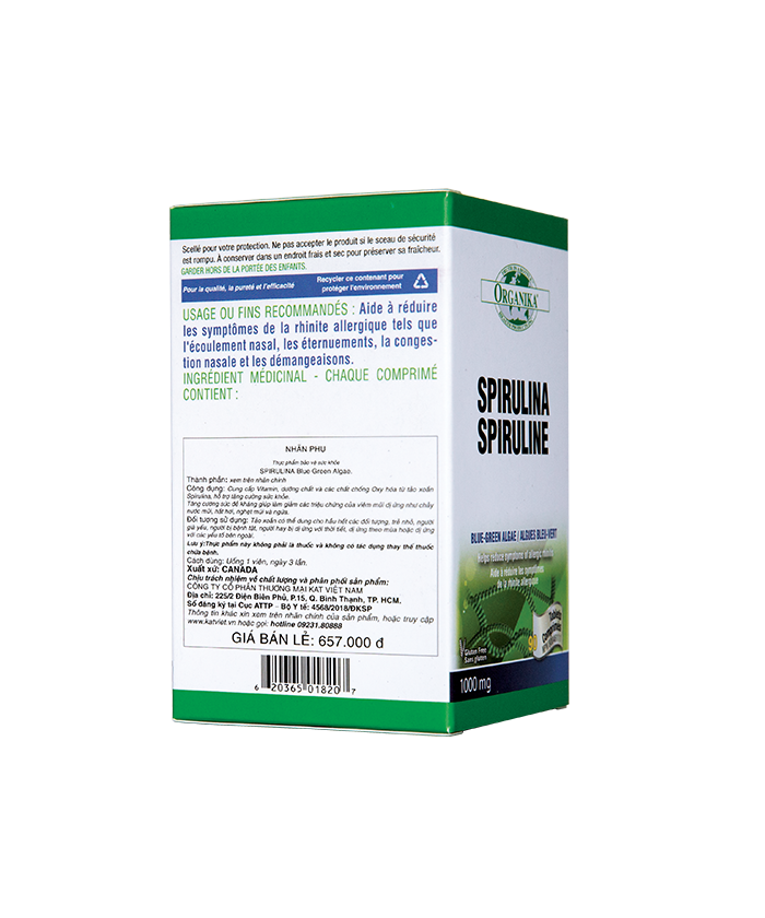 Thành phầnMỗi viên nén chứa 1000mg Tảo xoắnThành phần khác: Stearic Acid, Croscarmellose, Silica, Cellulose vi tinh thể, Magnesi, S 657.000đ