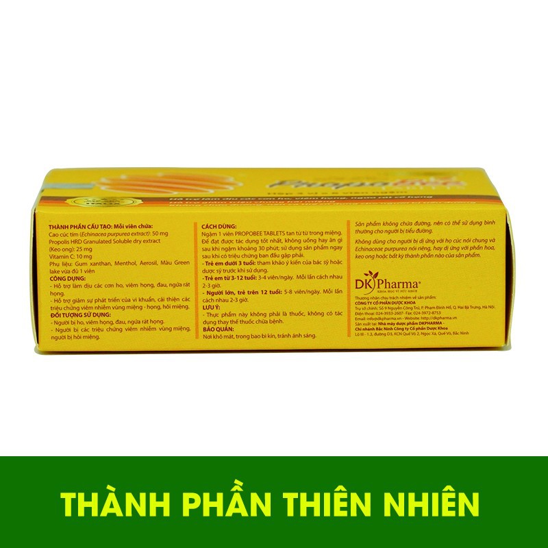 Propolis HDR Granulated soluble dry extract (keo ong) : 25 mg; Cao cúc tím (Echinacea purpurea extract): 50mg; Vitamin C : 10mg ;Phụ liệu: Gum xanthan, Menthol, Aerosil, Màu Green lake vừa đủ 1 viên.
