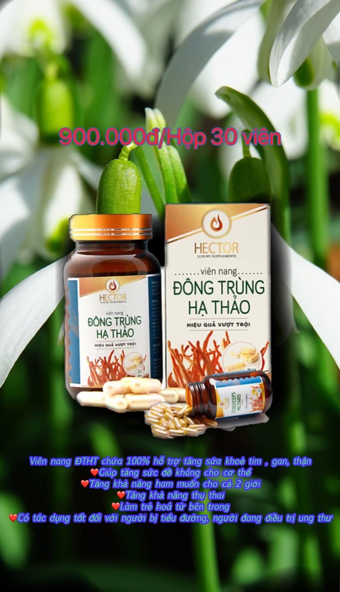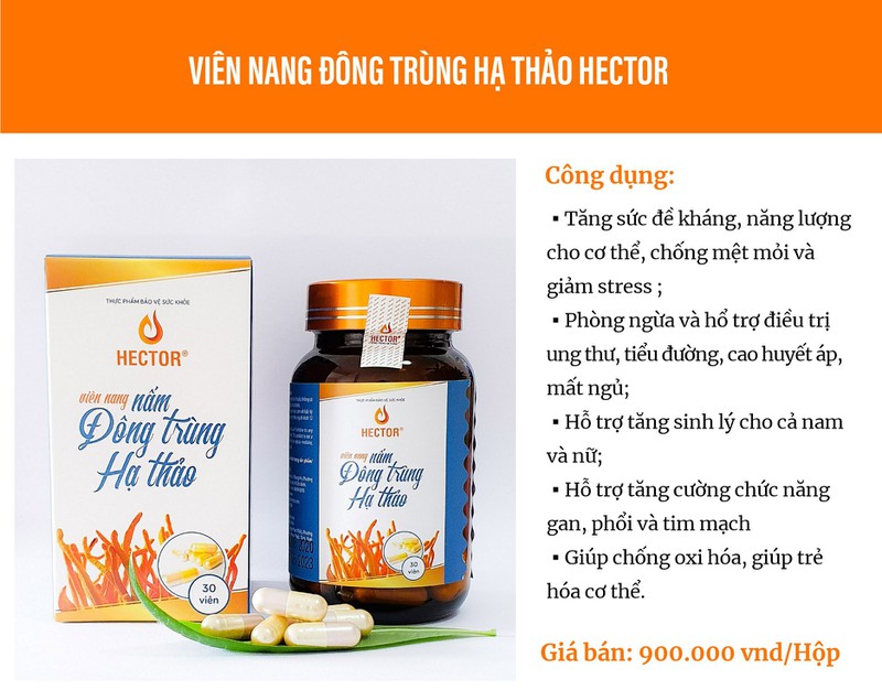 - Viên uống đông trùng hạ thảo Hector là sản phẩm được nghiên cứu bởi những chuyên gia đầu ngành CNSH, nhằm mang đến năng lượng cho người sử dụng. Sản phẩm giúp tăng sức khỏe, sức bền, tăng sinh lực, sinh lý, bảo vệ và phục hồi chức năng gan, ổn định đường huyết và huyếp áp.