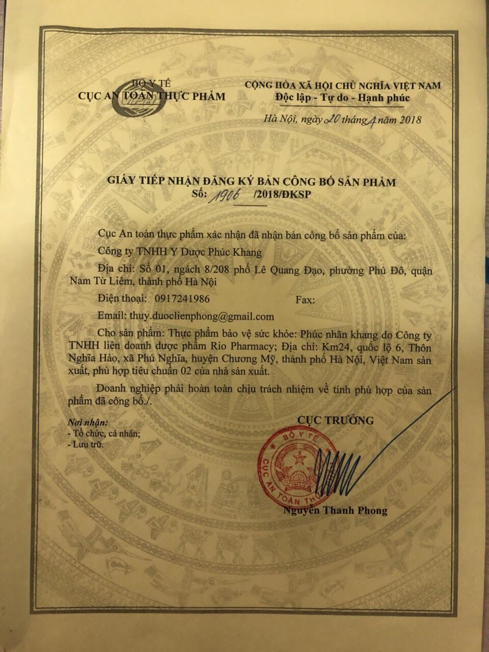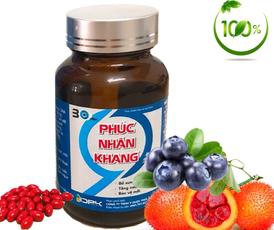 1. Công dụng - Bổ sung các dưỡng chất cho mắt, tăng cường thị lực cho mắt. - Chống khô mỏi mắt, nhìn mờ, giảm thị lực.2.Thành phần Lutein: 5mg Dầu Gấc: 2mgOmega: 35UIAcid Folic: 100mg Beta caroten: 1000UI Vitamin C: 50mgL - Acetyl Cysteine: 50mg Vitamin E: 200UI DHA: 100mcgCao Việt Quất: 5mg Vitamin A: 100UI Co- enzym Q10: 10mcg3.Đối tượng sử dụng ► Học sinh, áp lực học tập nặng, đọc sách dài, tầm nhìn trong giai đoạn tăng trưởng► Thường xuyên sử dụng mắt, thời gian dài sử dụng điện thoại di động, xem máy tính, lái xe, làm thêm giờ, ở lại muộn và không ngủ, vv► Người già bị đục thủy tinh thể, mờ mắt, mỏi mắt, bị khô mắt.4. Hướng dẫn sử dụng- Ngày uống 2 lần, mỗi lần 2 viên5. Sản phẩm Phúc Nhãn Khang được cấp giấy đăng ký phù hợp quy định an toàn thực phẩm số 1906/2018/ĐKSP• Xuất xứ: Việt Nam