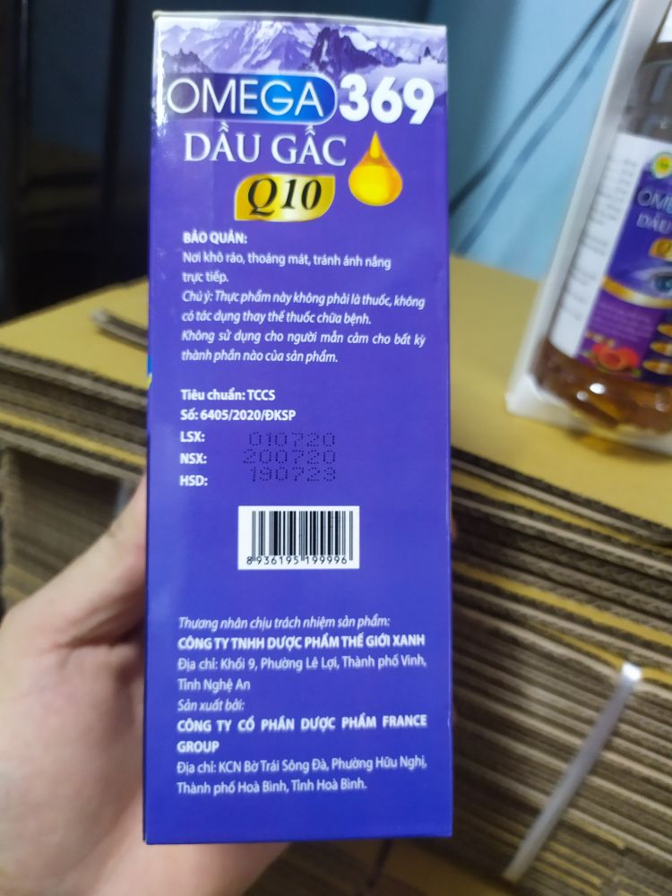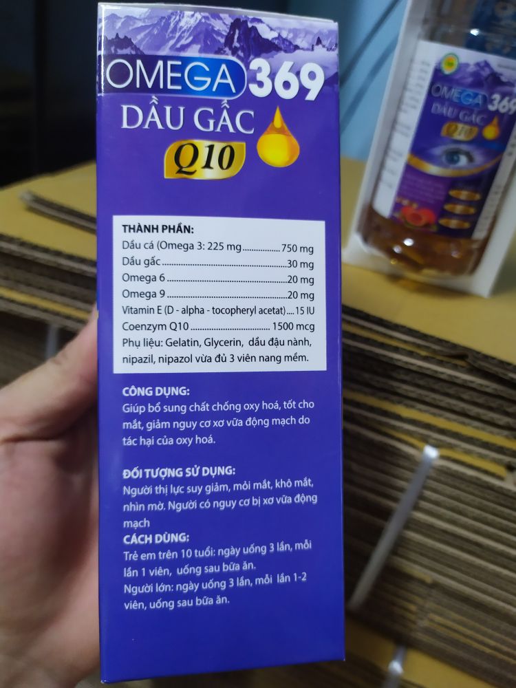 Dầu gấc omega3.6.9 dầu cá đẹp da chống lão hóa, nhức mắt ,mỏi mắtOmega369 Hỗ trợ tăng cường thị lực cho mắt, giảm mỏi mắt, nhức mắt, khô mắt nhìn mờ lọ 60 viênOmega369 Hỗ trợ tăng cường thị lực cho mắt, giảm mỏi mắt, nhức mắt, khô mắt nhìn mờ lọ 60 viênThành phầnTrong 3 viên có chứa Dầu cá 750mgDầu gấc ...30mgOmega6 ...Omega9....Vitamin a....Vitamin EDi-alpha tocopheryl acetat 15IUPhụ liệu vừa đủCông dụngOmega369 Hỗ trợ tăng cường thị lực cho mắt, giảm mỏi mắt, nhức mắt, khô mắt nhìn mờ lọ 60 viênĐối tượng sử dụng Người khô mắt nhức mỏi mắt, thoái hoá võng mạc mắt nhìn mờCách dùngNgười lớn 1-2 viên lần. 2-3 lần ngàyTrẻ trên 10 tuổi 1 viên lần. 2 lần ngàyBảo quản nơi khô ráo Thoáng mát 🌞 Sẵn sàng đổi trả hoặc hoàn lại tiền cho khách trong 48h kể từ ngày nhận hàng nếu sản phẩm lỗi hoặc hư hỏng trong quá trình vận chuyển ❤ 🎯 Luôn tư vấn tận tâm, nhiệt tình với tâm của người Bán 🎯Đảm bảo tất cả sản phẩm luôn chính hãng 100%, nguồn gốc xuất xứ rõ ràng. LƯU Ý: • Sản phẩm này không phải là thuc và không có tác dụng thay thế thuc chữa b!