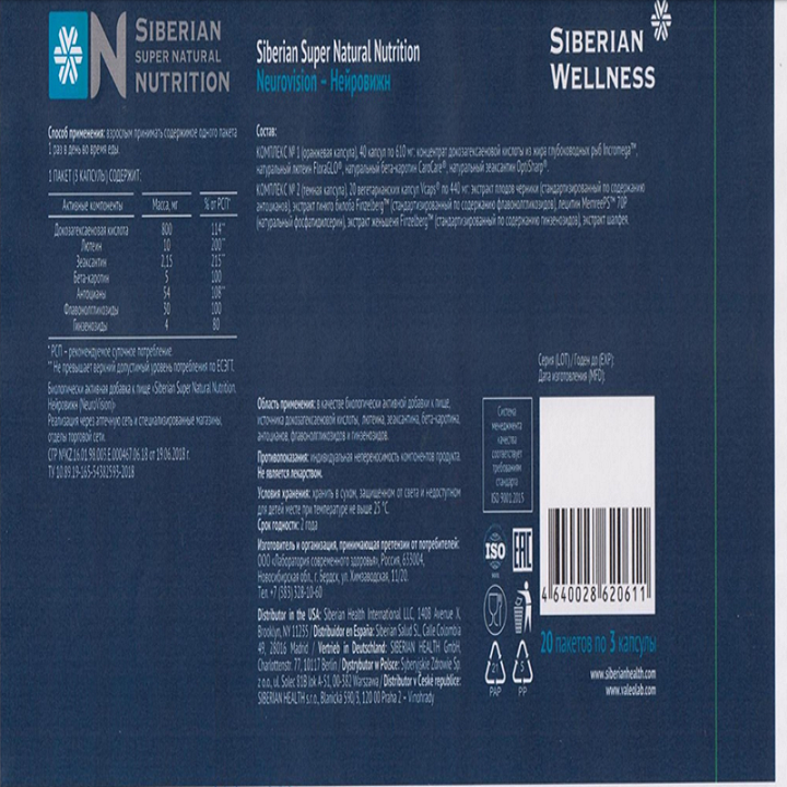 Thực phẩm bảo vệ sức khỏe hạn chế quá trình lão hóa mắt và hỗ trợ hạn chế thoái hóa điểm vàng và tăng cường thị lực Siberian Super Natural Nutrition Neurovision