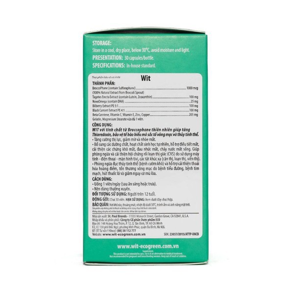 *Thành phần viên uống bổ mắt Wit:-Broccophane: 1000mcg-Bilberry Extract PE 5:1…100mg-Tagetes Erecta Extract: 100mgBlack Currant Extract PE 4:1…100mg-NovoOmega: 25mg-Beta carotene, Zinc, Vitamin E, Vitamin C, Copper: 205mg