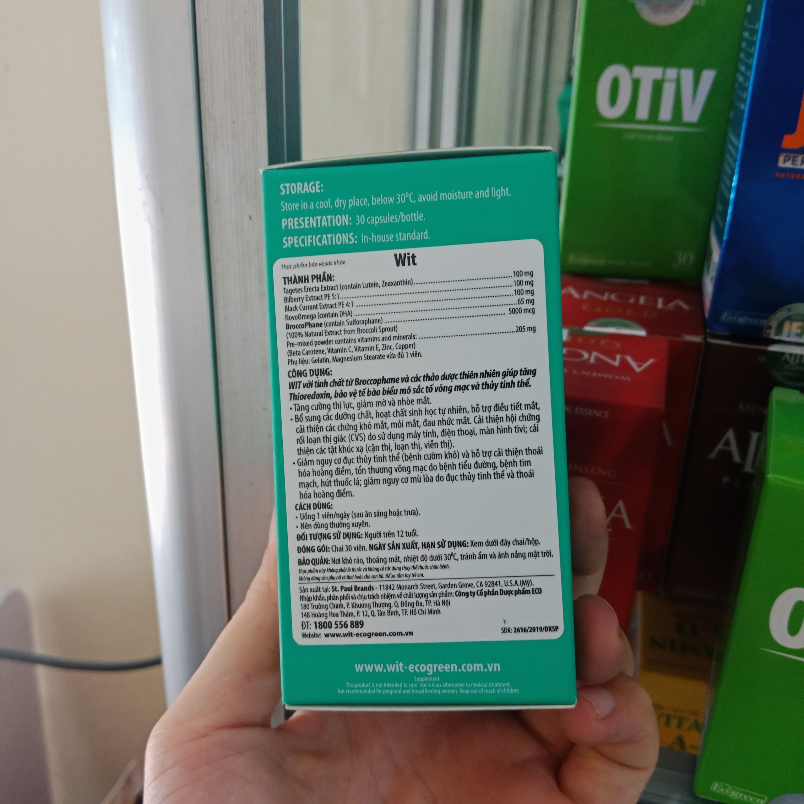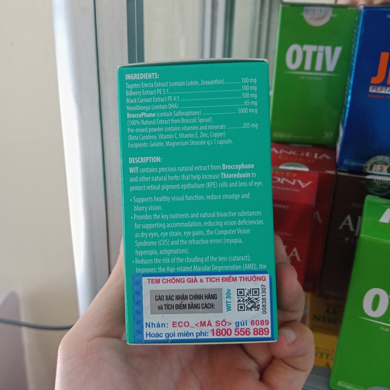 Viên uống bổ mắt Wit 30 viên của MỹCông dụng của viên bổ mắt WitViên bổ mắt Wit giúp tăng cường thị lực cho mắt, giảm các triệu chứng mờ mắt và nhòe mắtBổ sung những dưỡng chất và hoạt chất sinh học từ tự nhiên, hỗ trợ điều trị mắt, cải thiện khô mắt, đau nhức và chảy nước mắt sốngPhòng ngừa và cải thiện hội chứng rối loạn thị giác do sử dụng máy tính, ti vi, điện thoại, phòng ngừa cận thị, loạn thị, viễn thịPhòng ngừa đục thủy tinh thể, hỗ trợ cải thiện những tổn thương về mắt, võng mạc,…Giảm nguy cơ mù lòa do bệnh võng mạc và thủy tinh thểTinh chất từ Broccophane thiên nhiên giúp tăng Thioredoxin, bảo vệ tế bào võng mạc và thủy tinh thể giúp tăng cường thị lựcHướng dẫn sử dụngLiều dùng tiện lợi chỉ 1 viên/ngày (Có thể sử dụng sau ăn sáng hoặc ăn trưa)Nên duy trì dùng thường xuyên để chăm sóc và bảo vệ mắt từ bên trongLưu ý:Độ tuổi thích hợp khuyên dùng là từ 12 tuổi trở lênKhông dùng cho phụ nữ có thai và cho con bú