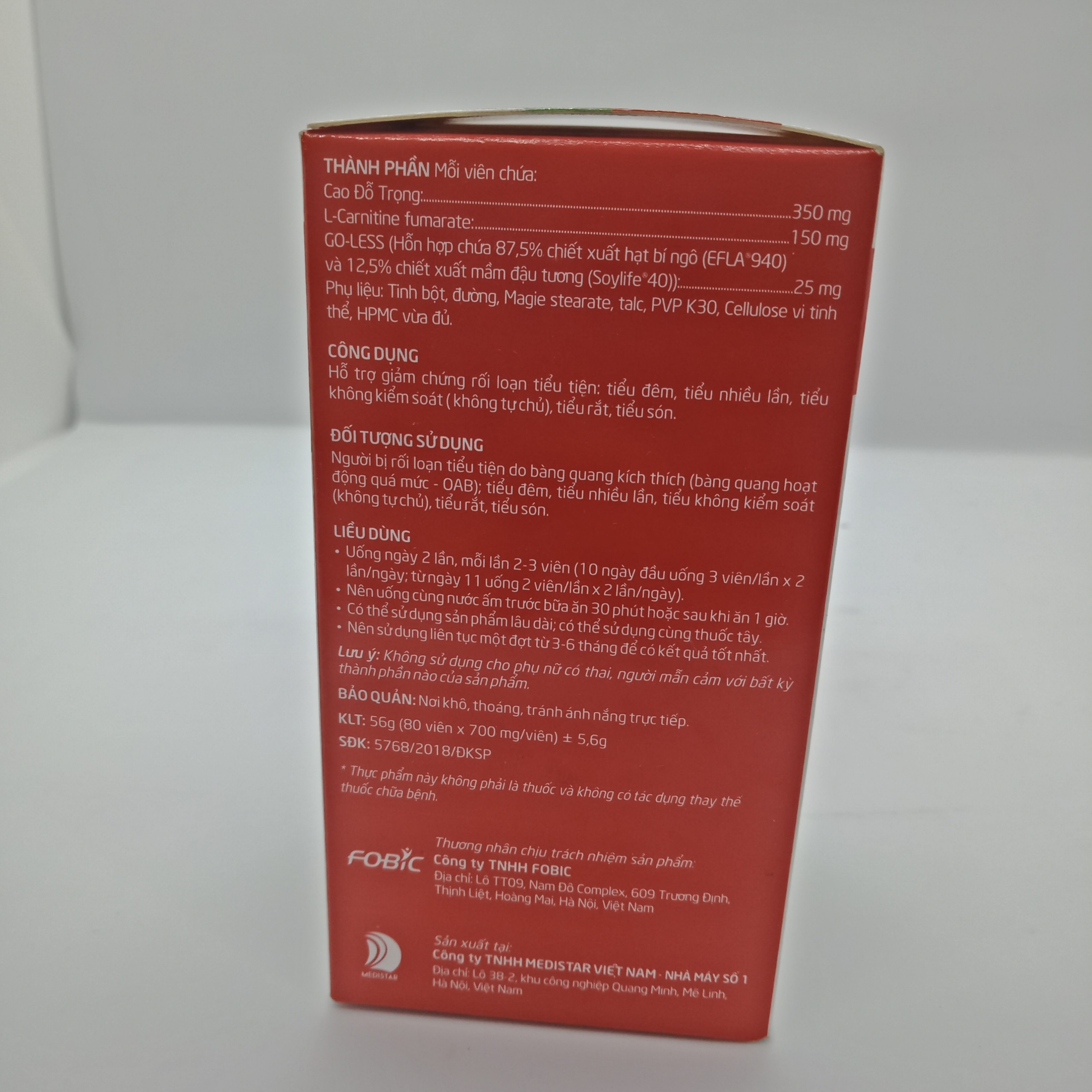| Thành phần | - GO-LESS (Hỗn hợp chứa 87,5% chiết xuất hạt bí ngô (EFLA®940) và 12,5% chiết xuất mầm đậu tương (Soylife®40)): 25 mg- Cao Đỗ Trọng: 350 mg- L-Carnitine fumarate: 150 mg |