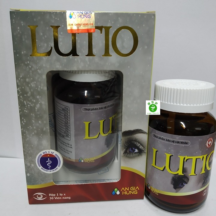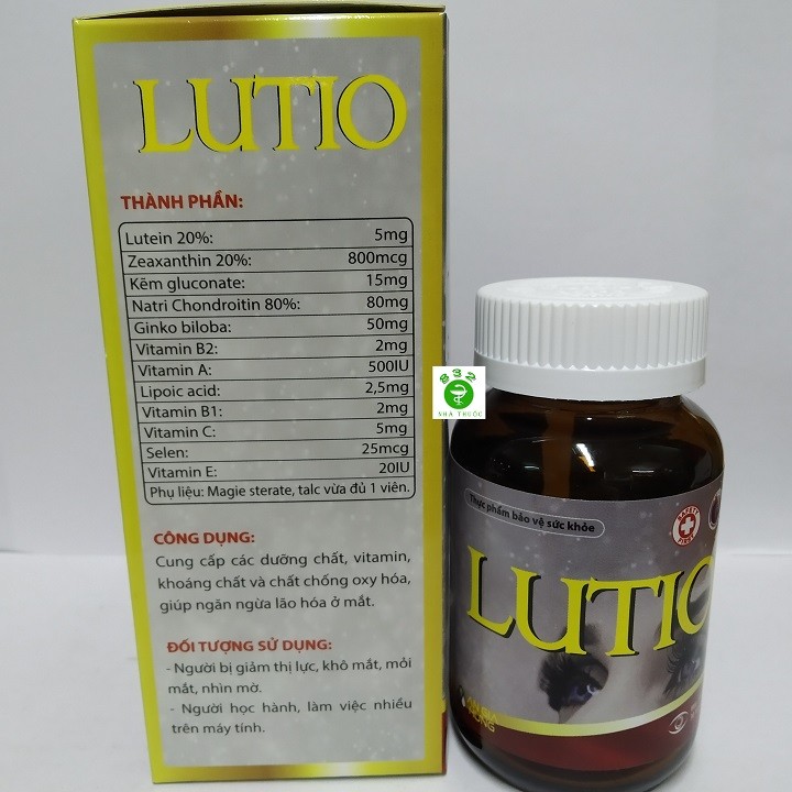 Thành phần của Viên bổ mắt Lutio:- Lutein 20%: 5mg- Zeaxanthin 20%: 800mcg- Kẽm Gluconate: 15mg- Natri chondroitin 80%: 80mg- Ginkgo biloba: 50mg- Vitamin B2: 2mg- Vitamin A: 500IU- Lipoic acid: 2.5mg- Vitamin B1: 2mg- Vitamin C: 5mg- Selen: 25mcg- Vitamin E: 20IU