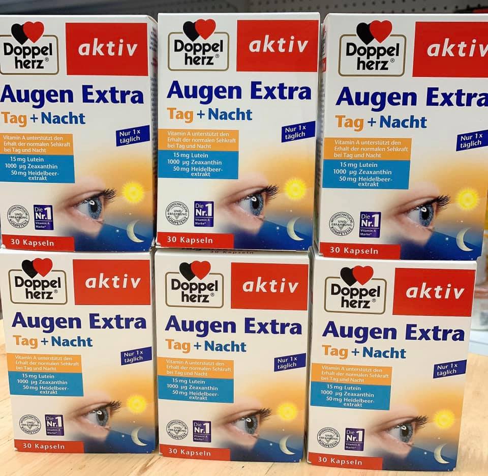 Viên uống tốt cho mắt augen extra tag nacht D o p p e l h e r z giàu thành phần vitamin A, C, E, B, cùng các nguyên tố vi lượng kẽm và đồng giúp nuôi dưỡng đôi mắt khỏe mạnh