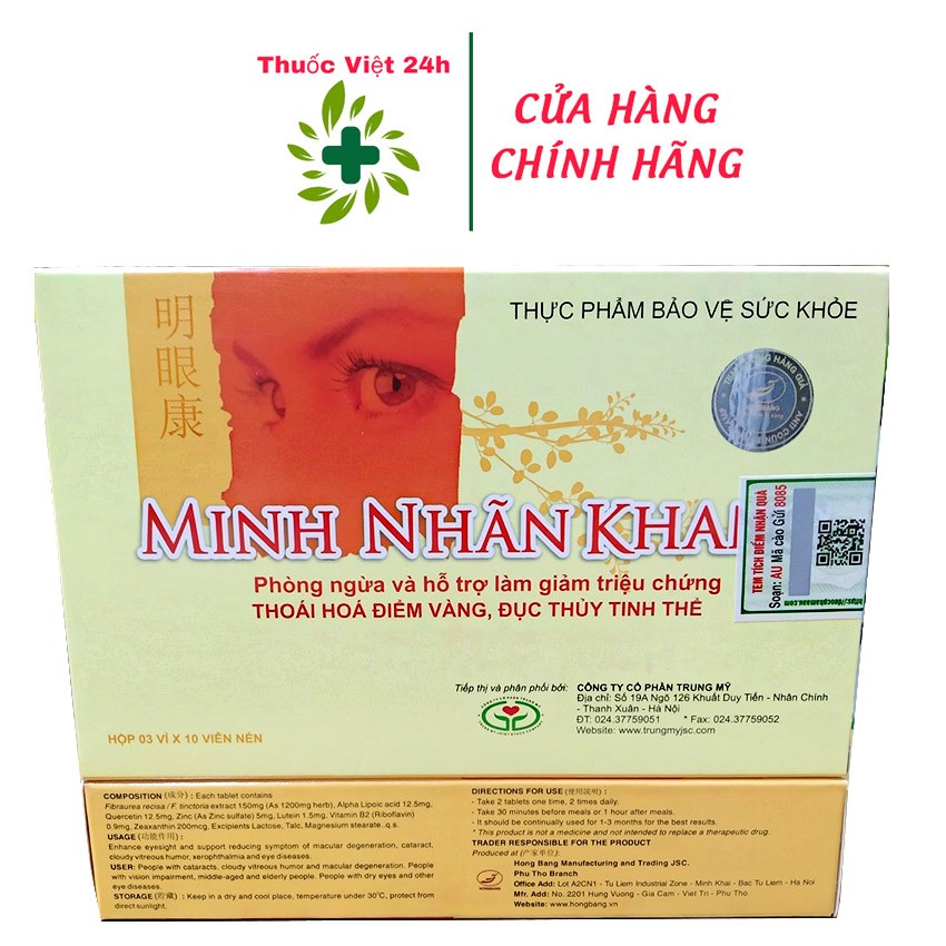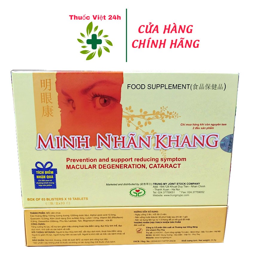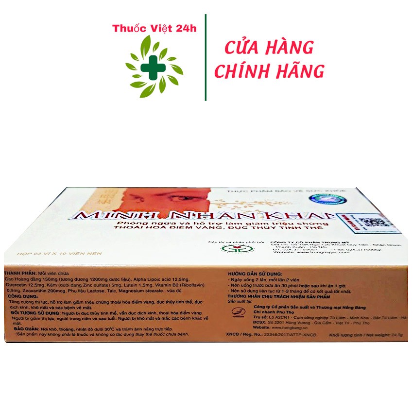 Minh Nhãn Khang (Hộp 30 viên) - bổ mắt, hỗ trợ giúp tăng cường thị lực, giảm đục thủy tinh thể - thuocviet24h