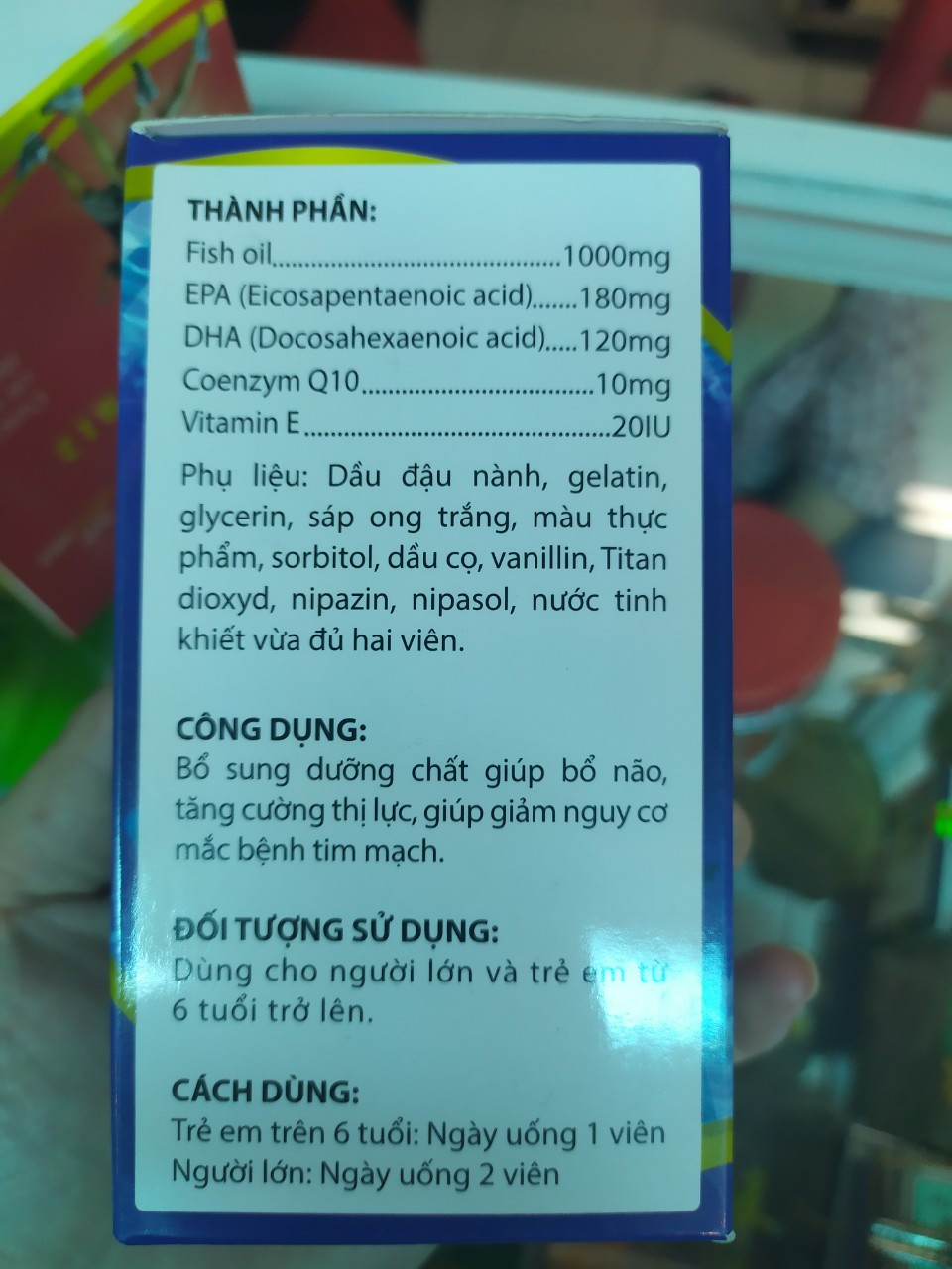 THÀNH PHẦN: Fish oil - 1000mgEPA ( eicosapentaenoic acid) - 180mgDHA - 120mgCoenzym Q10 - 10mgVitamin E - 20IUHộp 100 viênĐỐI TƯỢNG SỬ DỤNG: Người lớn và trẻ em trên 6 tuổi