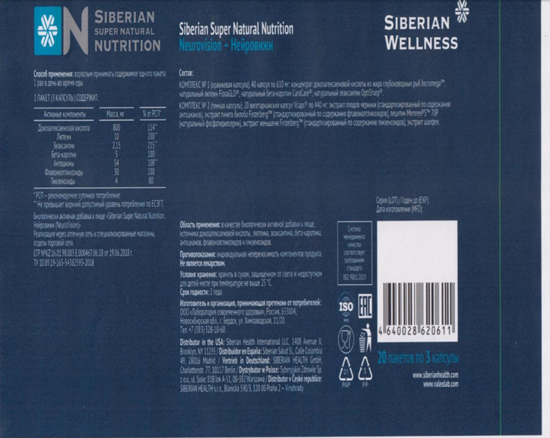 Thực phẩm bảo vệ sức khỏe hạn chế quá trình lão hóa mắt và hỗ trợ hạn chế thoái hóa điểm vàng và tăng cường thị lực Siberian Super Natural Nutrition Neurovision
