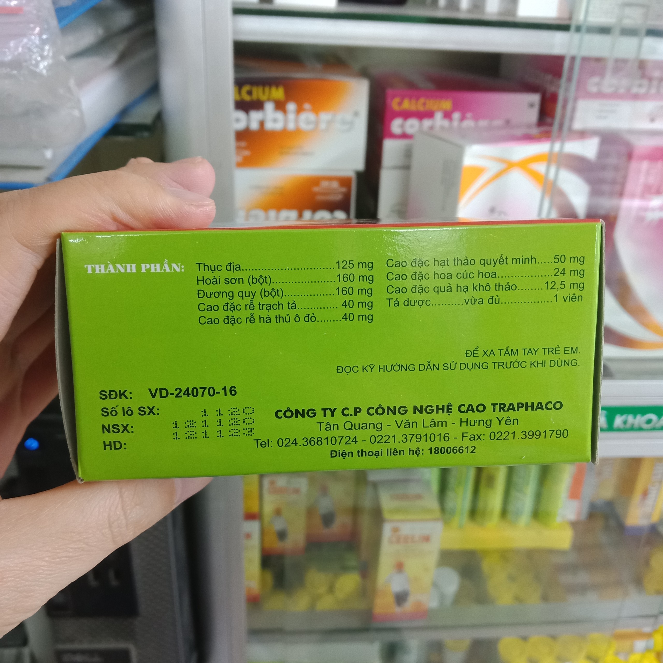 3. Thông tin thuốc:Thành phần: Thục địa, hoài sơn (bột), đương quy (bột), cao đặc trễ trạch tả,…Quy cách đóng gói: Hộp 10 vỉ x 10 viên.Xuất xứ thương hiệu: Việt NamNhà sản xuất: Traphaco