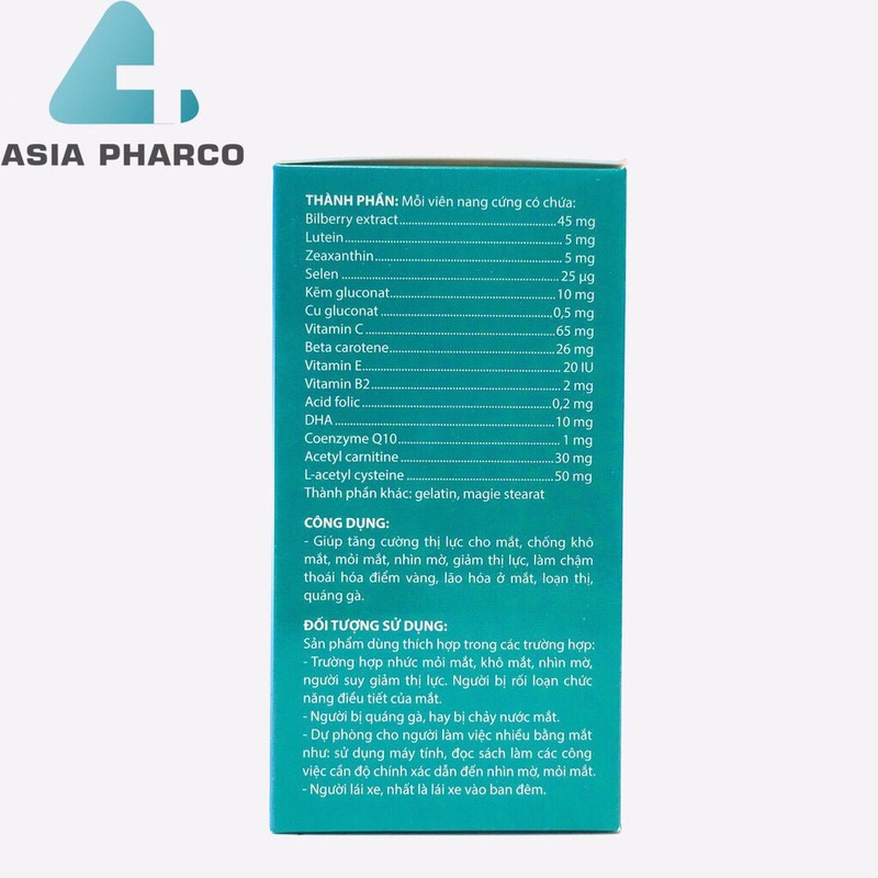 CÔNG DỤNG:mỗi viên chứabilberry extract.............................................45.0mglutein .............................................5.0mgzeaxanthin............................................. 4.0mgselen............................................. 25.0mcgkẽm gluconat............................................. 10.0mgcu gluconat............................................. 0,5mgvitamin C .............................................65.0mgbeta carotene............................................. 26mgvitamin E .............................................20.0IUvitamin B2............................................. 2.0mgacid folic .............................................0,2mgDHA .............................................10,0mgcoenzyme Q10............................................. 1.0mgacetyl carnitine .............................................30.0mgL-acetyl cysteine .............................................50.0mgcác phụ liệu khác vừa đủ 1 viênĐỐI TƯỢNG SỬ DỤNG:Sran phẩm dfng thích hợp trong các trường hợp:-trường hợp nhức mỏi mawsrt, khô mắt, nhìn mờ, người suy giảm thị lực, người bị rối loạn chức năng điều tiết của mắt-người bị quáng gà hay bị chảy nước mắt'-dự phòng cho người làm việc nhiều bằng mắt như sử dụng máy tính, đọc sách làm các công việc cần độ chính xác dẫn đến nhìn mờ, mỏi mắt-người lái xe HƯỚNG DẪN SỬ DỤNG:-người lớn: uống lần 1 viên x 2 lần/ngày, uống sau khi ăn-trẻ em 5-12 tuổi: uống 1 viên duy nhất , uống sau khi ăn