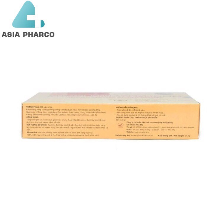 Cao Hoàng Đằng 150mg α-lipoic acid 12,5mg Quercetine 12,5mg Lutein 1,5mg Zeaxanthin 200mcg Kẽm 1,25 mg Vitamin B2 0,9mg