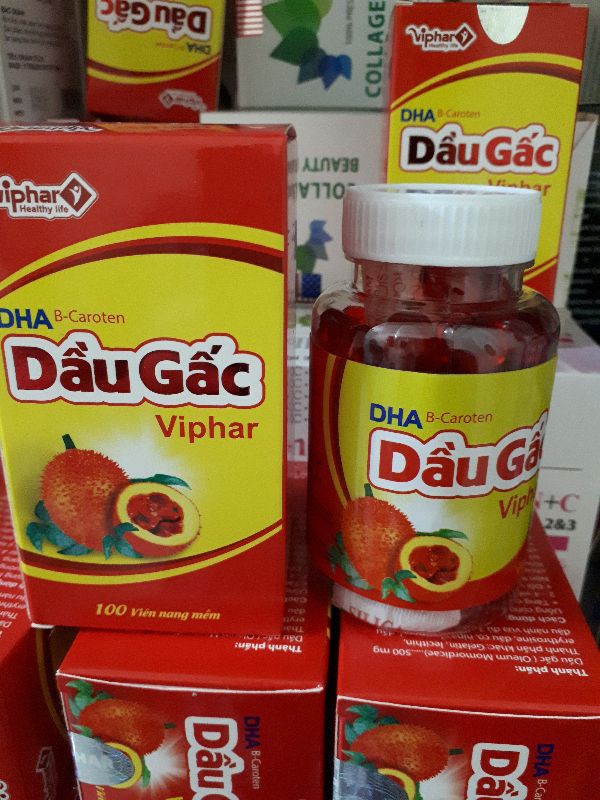 Dầu gấc 500mgTrong 100g dầu gấc chứaLycopen 35mgAlpha tocopherol 10mgBeta caroten 80mgDHA 10mg