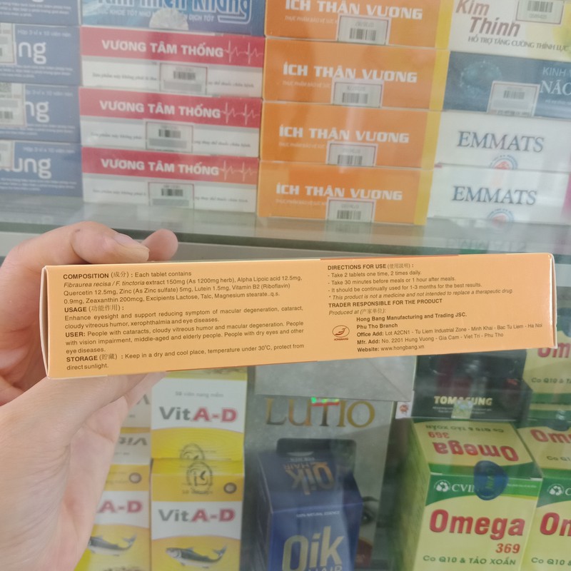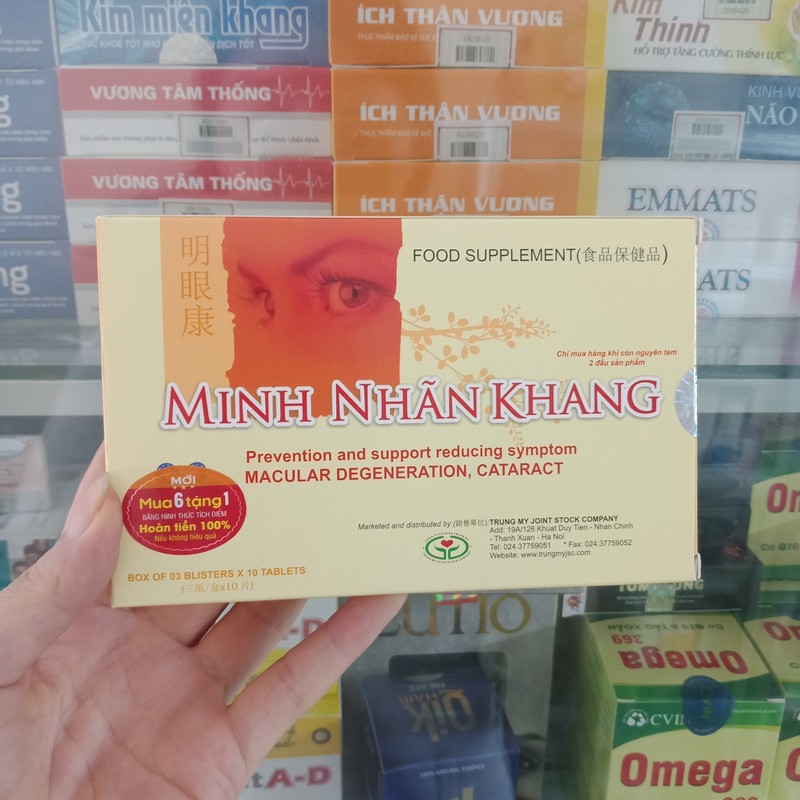 Thành phần của Minh Nhãn Khang Minh Nhãn Khang kết hợp 3 nhóm chất thiết yếu theo tỉ lệ công thức “vàng” dành cho mắt, giúp mắt luôn đầy đủ dinh dưỡng, được bảo vệ tối đa. • Hoàng đằng • Zeaxanthin • Alpha lipoic acid (α-Lipoic acid) • Quercetin • Lutein • Kẽm • Vitamin B2 (Riboflavin) ________________________________________ Công dụng của Minh Nhãn Khang Bằng việc cung cấp các thành phần dinh dưỡng đầy đủ cho mắt, được sản xuất trên dây chuyền hiện đại đạt chuẩn GMP, Minh Nhãn Khang giúp đôi mắt luôn được bảo vệ trước các tác nhân gây suy giảm thị lực và các yếu tố oxy hóa theo thời gian. • Phòng ngừa mù lòa do thoái hóa điểm vàng và đục thủy tinh thể: cung cấp các dưỡng chất có lợi cho mắt và kháng sinh bảo vệ mắt. • Tăng cường thị lực và hỗ trợ điều trị thoái hóa điểm vàng, đục thủy tinh thể: bổ sung các chất chống oxy mạnh, làm giảm sự tiến triển của bệnh. Có Minh Nhãn Khang không còn nỗi lo thoái hóa điểm vàng, đục thủy tinh thể. “Cửa sổ tâm hồn” của bạn sẽ luôn sáng đẹp thách thức mọi thời gian. ________________________________________ Liều dùng Cách dùng • Ngày uống 2 lần, mỗi lần 2 viên cho mục đích phòng ngừa hoặc theo hướng dẫn của bác sỹ điều trị. • Nên uống trước bữa ăn 30 phút hoặc sau khi ăn 1 giờ. • Nên sử dụng liên tục từ 3-6 tháng để có kết quả tốt nhất. Đối tượng sử dụng • Dùng cho người giảm thị lực, đục thủy tinh thể, thoái hóa điểm vàng, khô mắt và có các bệnh về mắt. ________________________________________ Tác dụng phụ Chưa có báo cáo về tác dụng phụ của sản phẩm. ________________________________________ Lưu ý • Sản phẩm này không phải là thuốc và không có tác dụng thay thế thuốc chữa bệnh. • Tác dụng tùy thuộc vào cơ địa của mỗi người.