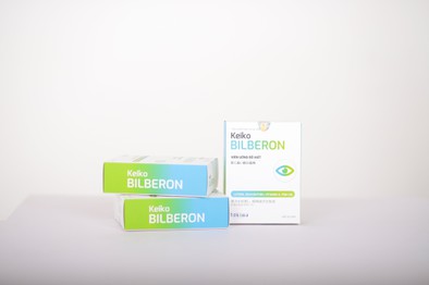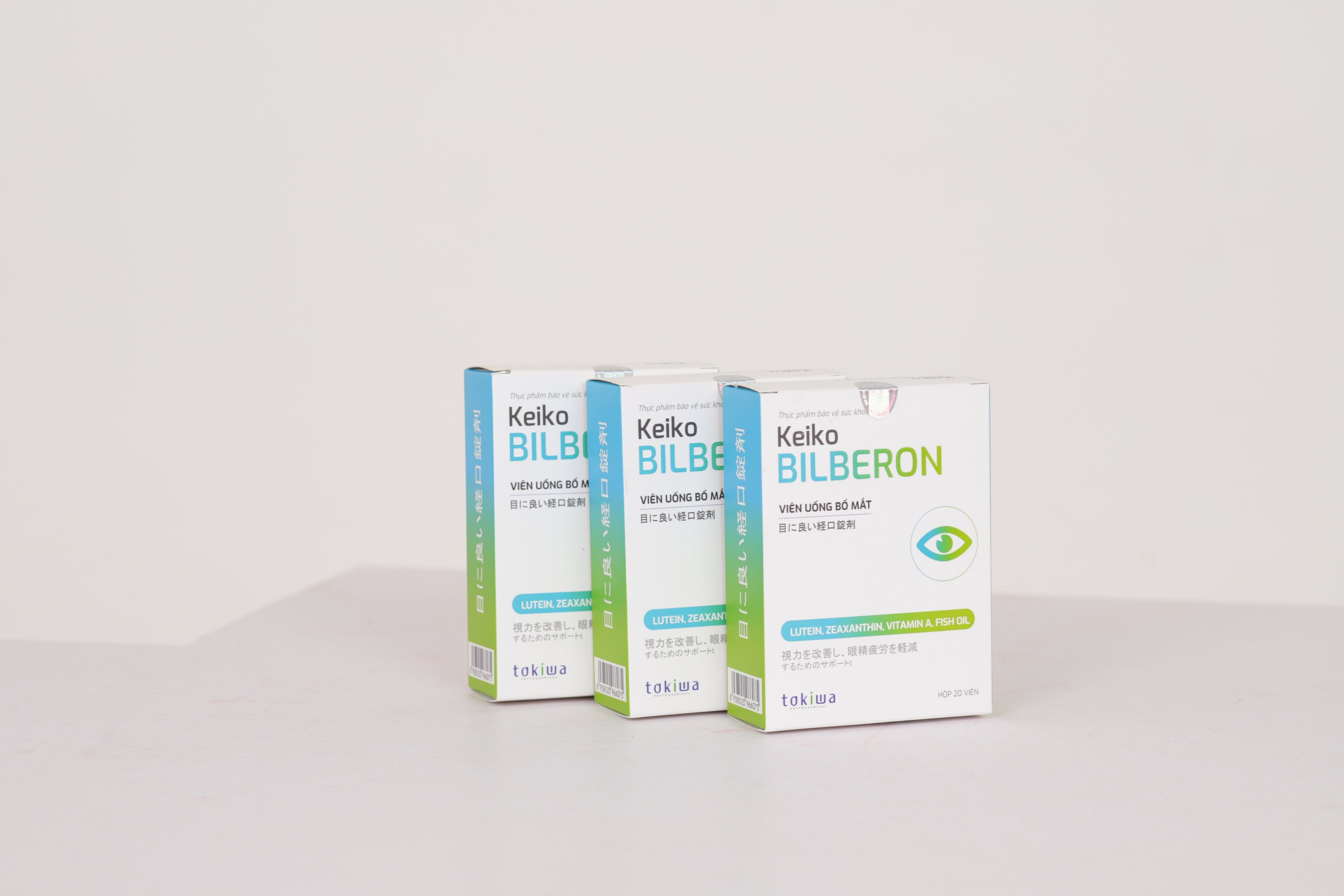 Sản phẩm viên uống bổ mắt: KEIKO BILBERON chứa hoạt chất Bilberon-25 chiết xuất từ quả việt quất với hàm lượng 60 mg/viên kết hợp với Ginkgo biloba từ lá cây bạch quả, và các thành phần cần thiết cho hệ thần kinh và đôi mắt khoẻ mạnh: Kẽm, Vitamin B12, Vitamin A, acid Folic, Dầu cá (DHA, EPA)..