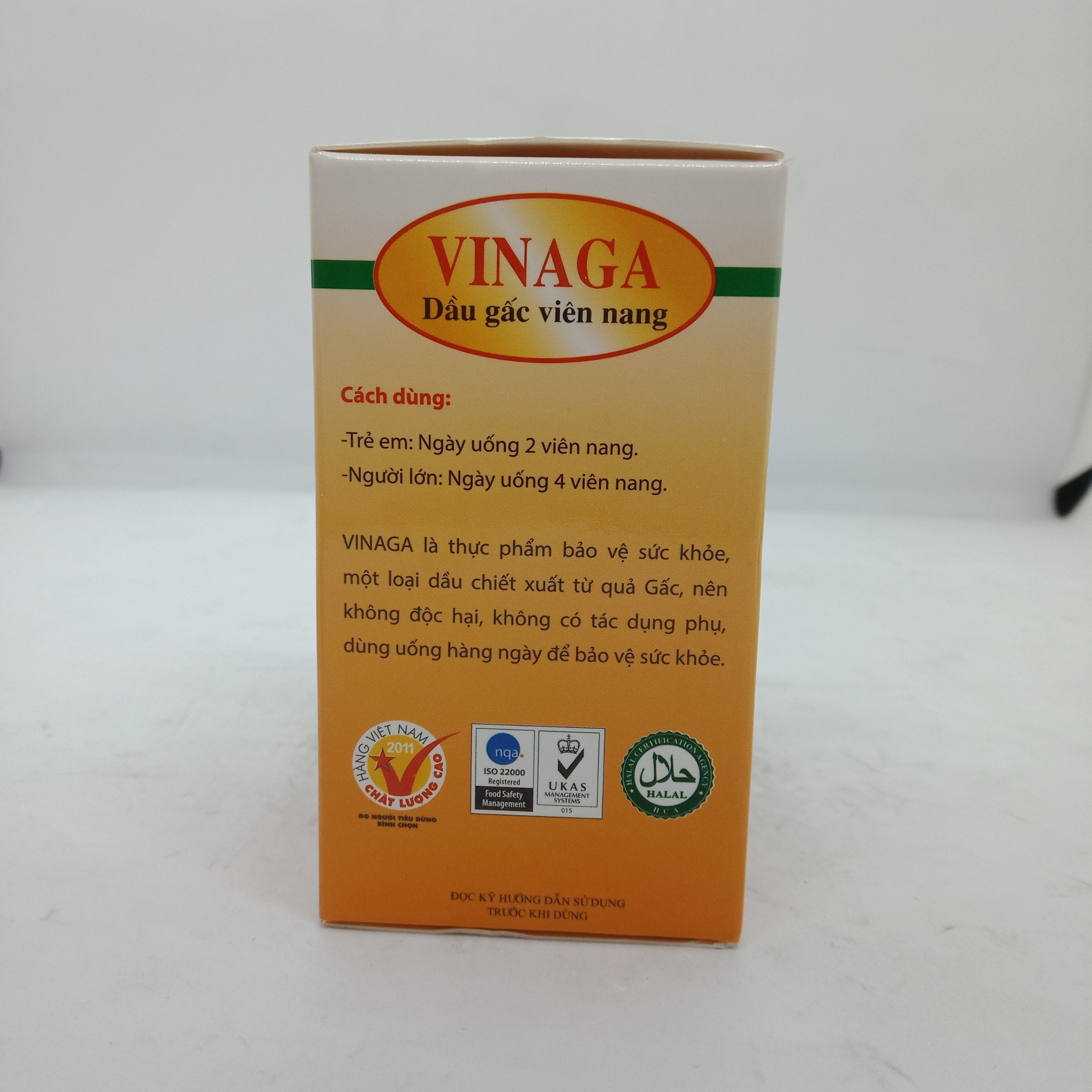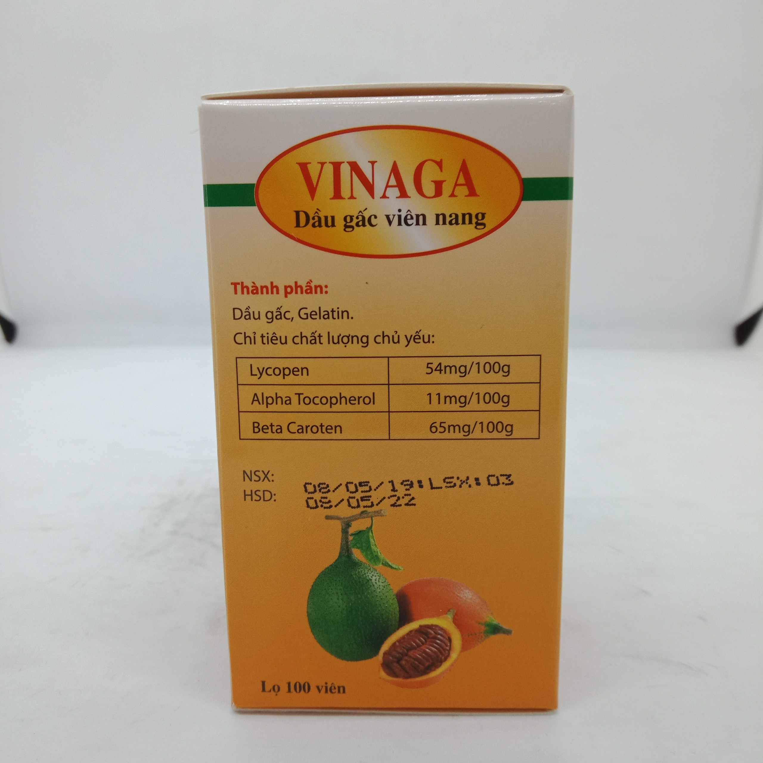 VINAGA là sản phẩm được chiết xuất từ màng đỏ của quả gấc, với thành phần 100% dầu gấc tinh khiết, chứa Beta Caroten 150mg% (cao gấp 15,1 lần cà rốt), Lycopen (cao gấp 68 lần cà chua), Vitamin E (Alphatocopherol 12mg%), rất nhiều chất béo thực vật như Oleic 14,4%; Linoleic 14,7%; Stearic 7,69%; Palmatic 33,38%... và các vi chất rất cần thiết cho cơ thể con người.