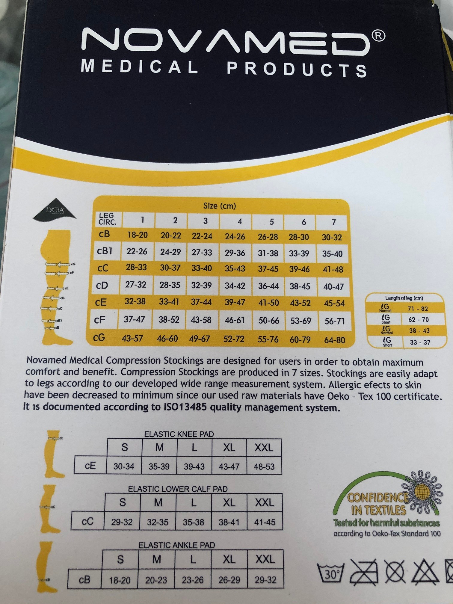 Vớ y khoa Vớ giãn tĩnh mạch đầu gối NOVAMED - Vớ ngắn ngay đầu gốiĐơn vị tính: 2 chiếc/hộpĐã được Cơ quan Quản lý thuốc và dược phẩm của NOVAMED( Thổ Nhĩ Kì ) cấp giấy chứng nhận đạt tiêu chuẩn chất lượng.Sản phẩm có tác dụng làm giảm đường kính các tĩnh mạch, khép các van tĩnh mạch ngăn máu chảy ngược xuống phần thấp của chân làm giảm hiện tượng nổi gân xanh ở chân, nặng chân, sưng phù.Sản phẩm giúp phục hồi chênh lệch áp suất trong hệ tĩnh mạch làm tăng tốc độ dòng máu chảy về tim, phòng ngừa sự hình thành huyết khối tĩnh mạch, giảm triệu chứng và điều trị suy tĩnh mạch.Sản phẩm ứng dụng công nghệ Sanitized® chống khuẩn, nấm mốc,ngăn sự phát triển mùi hôi, giúp bạn tươi mát suốt cả ngày và không lo dị ứng.Vớ được thiết kế hở ngón phù hợp cho bệnh nhân đái tháo đường, rối loạn dinh dưỡng da hay gặp các vấn đề ở ngón chân.Được sản xuất bằng công nghệ cao, máy móc tiên tiến,thiết kế đa dạng, hợp thời trang, trông không giống vói vớ y khoa thông thường, sợi tổng hợp, kéo căng 4 chiều, và rất dễ dàng để đi vào và cởi ra.Cách bảo quản:- Có thể giặt máy hoặc giặt tay bằng nước ấm với xà phòng trung tính. Nên cho vớ vào túi giặt nếu giăt bằng máy. Tránh dầu mỡ, clo và các chất tẩy trắng khi giặt vớ.- Phơi vớ ở nơi thoáng mát, tránh nhiệt độ cao và ánh nắng trực tiếp.- Không ủi (là), sấy vớ.- Không vặn, xoắn, kéo chỉ hoặc dùng kéo cắt chỉ trên vớ.- Nếu vớ bị bám bẩn, làm sạch vớ bằng miếng xốp mềm, ẩm.Thích hợp cho cả nam và nữ.- Có thể sử dụng vớ khi làm việc lâu tại văn phòng, khi đi máy bay hoặc tàu xe đường dài trên 3 giờ…- Có 4 loại cho bạn lựa chọn.- Sản phẩm có 5 size: SIZEVớ được làm từ Chất liệu sợi Lycra làm từ sợi vải có tính co giãn đàn hồi rất cao