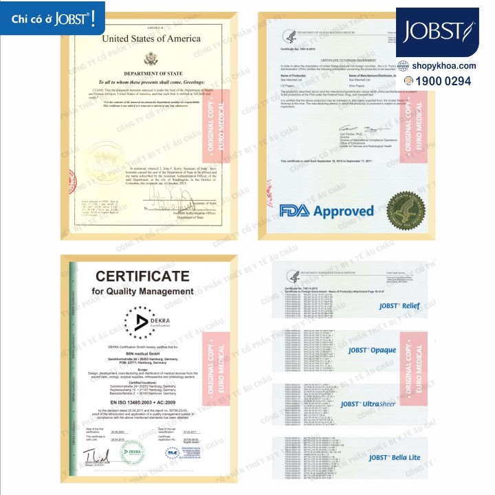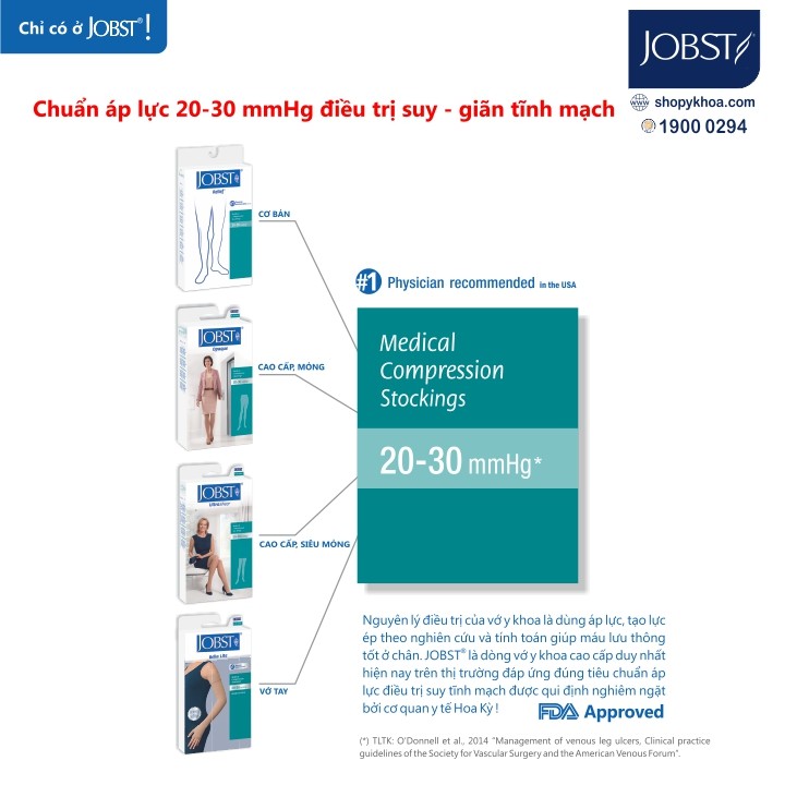 - JOBST là dòng vớ y khoa cao cấp duy nhất hiện nay trên thị trường đáp ứng đúng tiêu chuẩn áp lực cho người suy giãn tĩnh mạch chân sử dụng được qui định nghiêm ngặt bởi cơ quan y tế Hoa Kỳ.