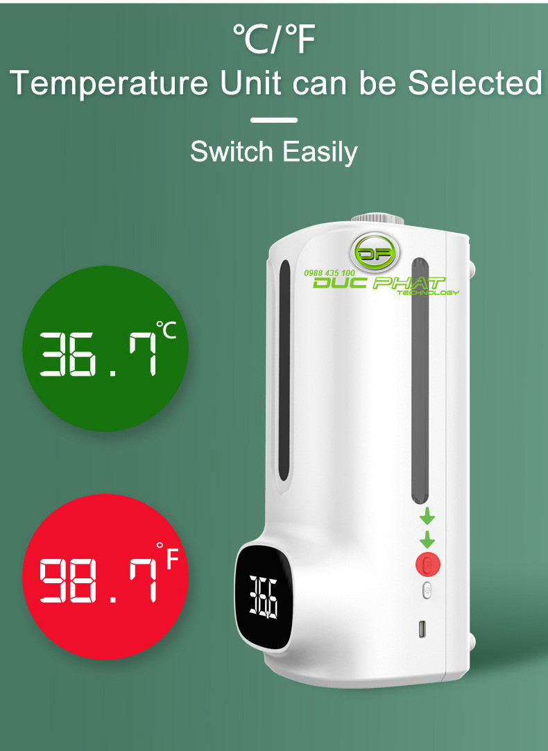 - Thông số sản phẩm:1. Đo Nhiệt Độ Độ chính xác: ± 0.2 ℃2. Chế độ báo động: bất thường tự động báo động3. Khoảng cách đo: 5cm ~ 10cm Tự động đo4. Màn hình hiển thị: Màn hình hiển thị kỹ thuật số5. Nhiệt độ báo động: Có thể điều chỉnh6. Thể tích đóng chai chất lỏng: 1200ml7. Phương pháp cài đặt: để bàn, treo tường, tam giác Chân đế cố định8. Nhiệt độ làm việc: 10 ℃ ~ 40 ℃9. Phạm vi đo: 0 ~ 50 ℃10. Chế độ chờ: 5S chờ trong không thời gian làm việc, chấm trắng năng động chu kỳ11. Kích thước sản phẩm: 119*133*280mm12. Trọng lượng sản phẩm: 952g13. Nguồn điện cung cấp : Cáp USB kết nối đốc sạc điện thoại 5V-2A, hoặc dùng 4 pin AA ( ko đi kèm)14. Sản phẩm công suất: 5W