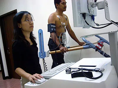 Trong khi bệnh nhân đi trên máy tập chạy hoặc đạp xe đạp, một máy đo điện tim được dùng để ghi nhận hoạt động của tim cùng với máy đo huyết áp. Đáp ứng của tim đối với việc tăng công này sẽ được theo dõi.